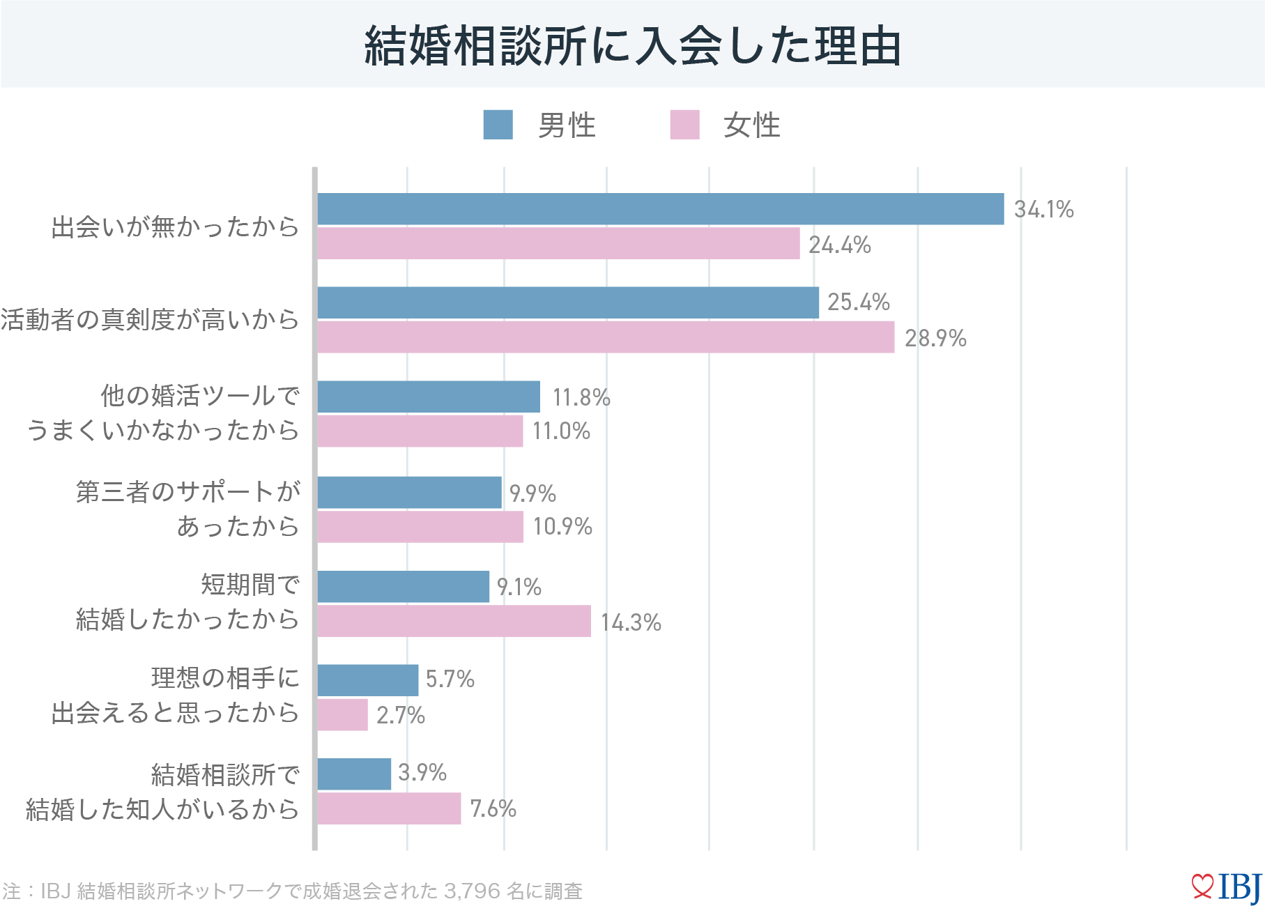 結婚相談所への入会理由として、男性は「出会いが無かった(34.1%)」女性は「活動者の真剣度が高い(28.9%)」が最多。