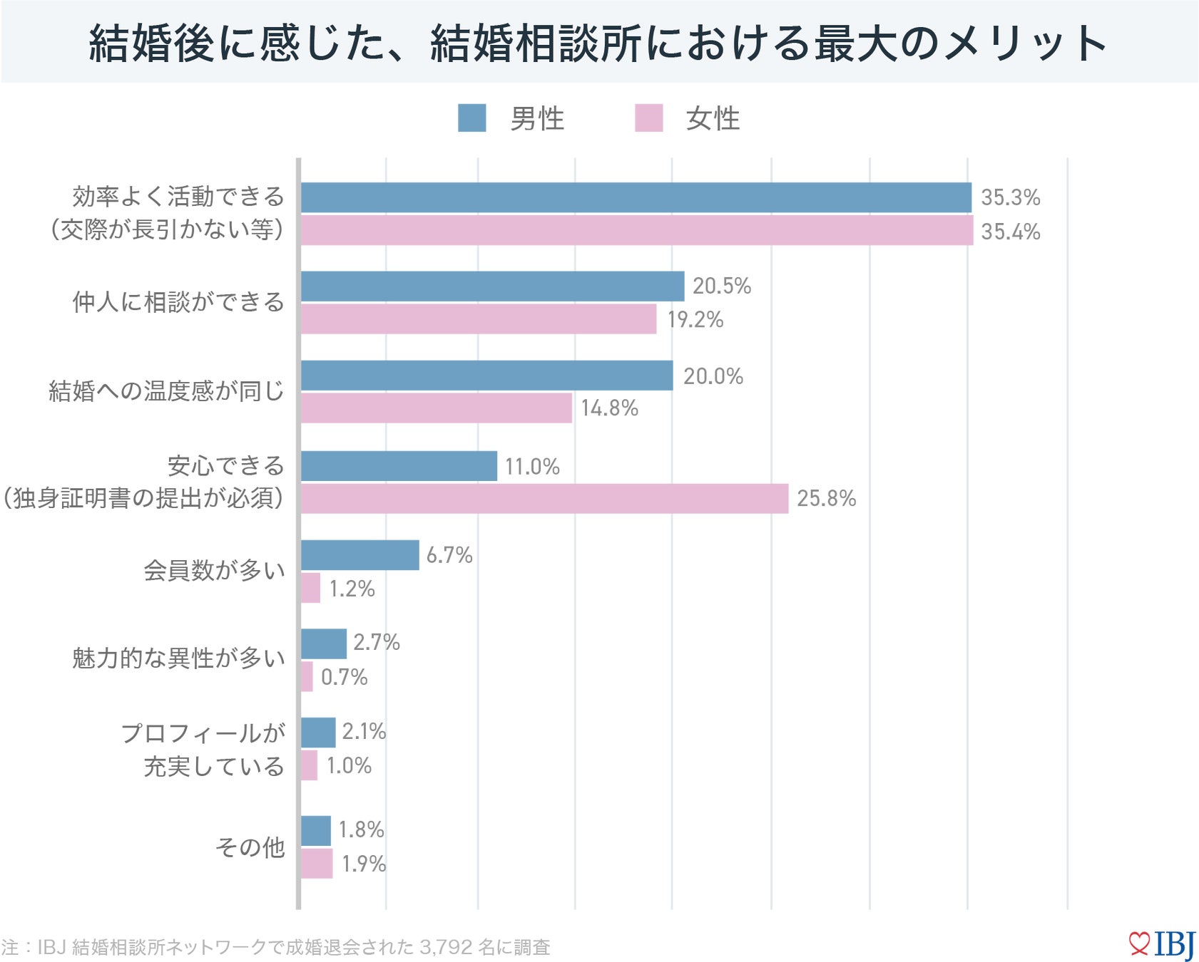 結婚後に感じた結婚相談所における最大のメリットとして、男女共に「効率よく活動できる(交際経験が長引かない等)」が最多となり、結果として、タイムパフォーマンスが高い活動を望んでいたことが分かりました。また、女性は「安心できる(独身証明書の提出が必須)」が25.8%と、男性よりも14.8ポイント高いことから、会員情報に偽りがないことや、安全性の高さを考えて選んでいることが窺えます。