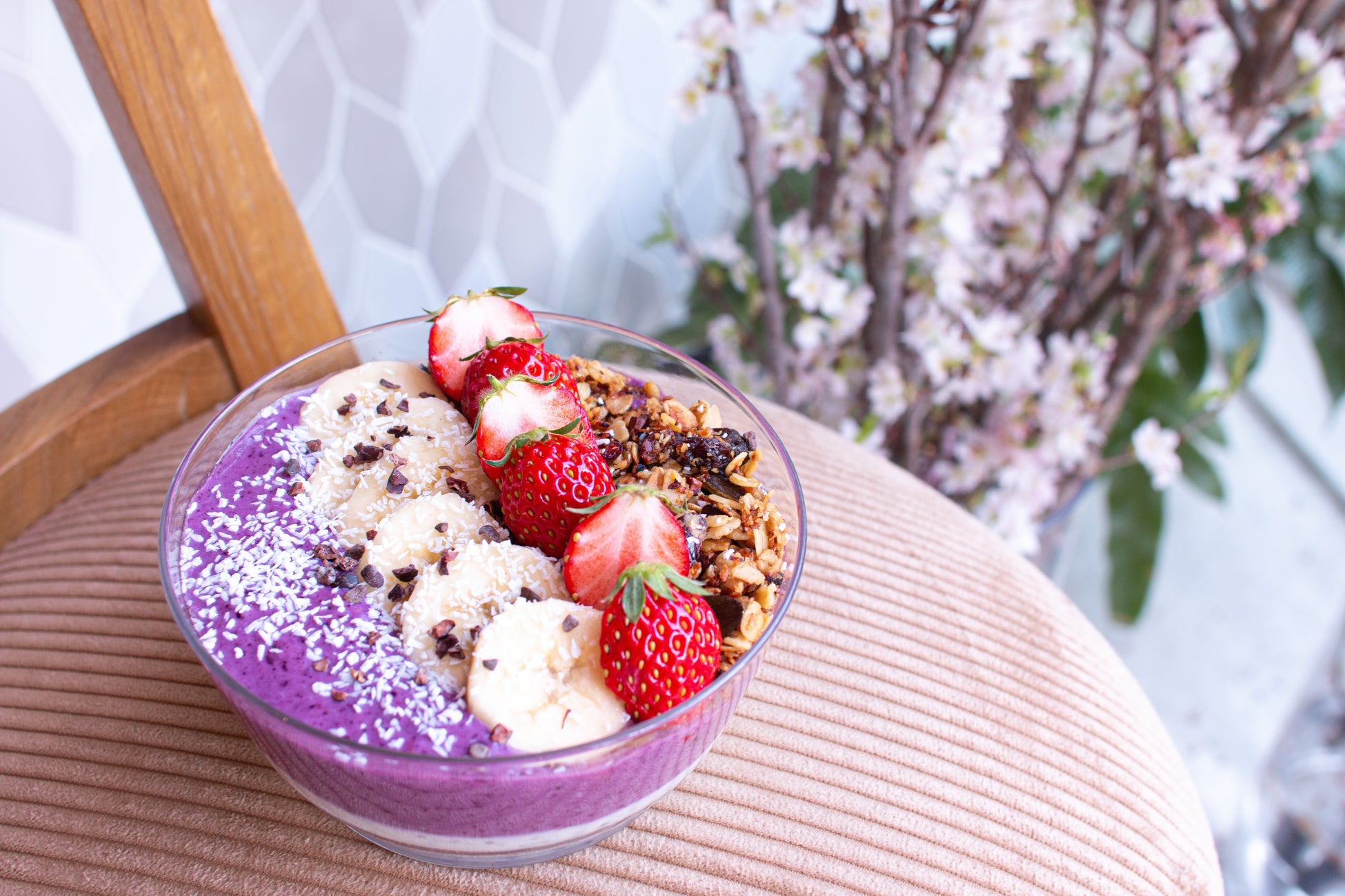 TREEの人気スムージー「ベリーグッドネス」を、豆乳ヨーグルトなどを使ってヴィーガン仕様にアレンジし、カットフルーツ、ココナッツファイン、カカオニブ、自家製グラノーラをトッピング。