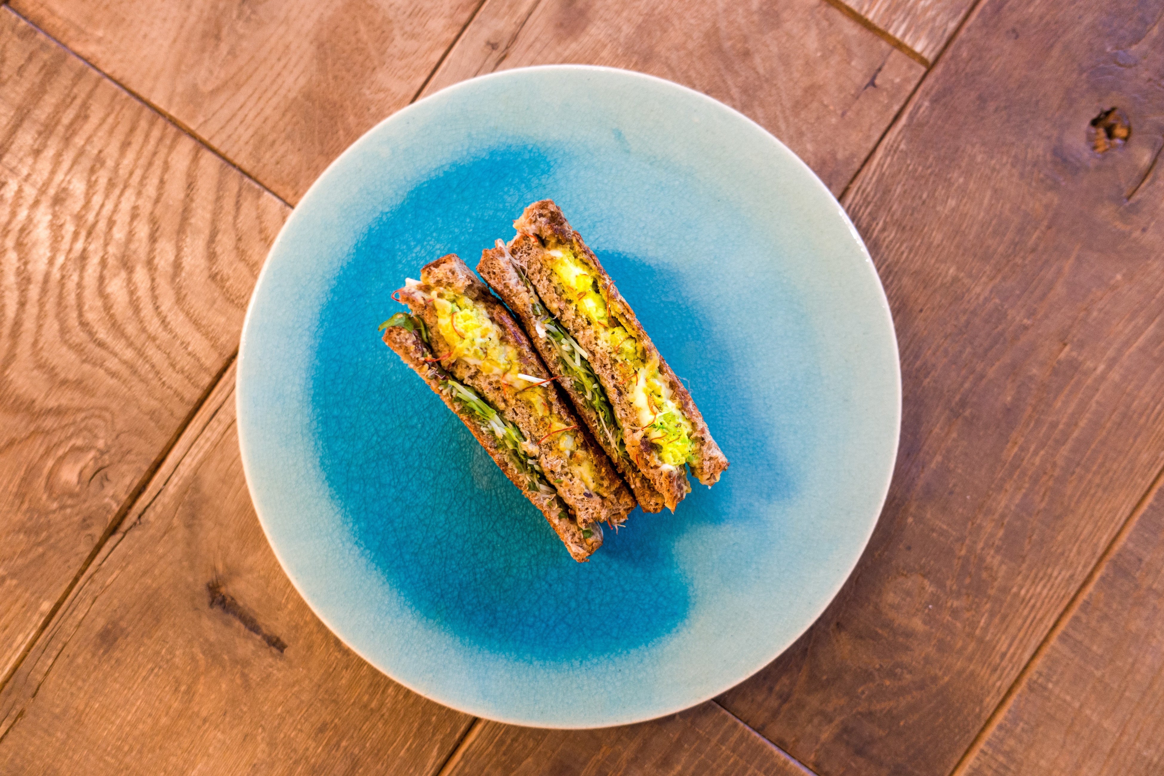 アボカド、ブロッコリースプラウト、ソイチーズを挟み、ココナッツオイルで香ばしく焼き上げたホットサンド。
