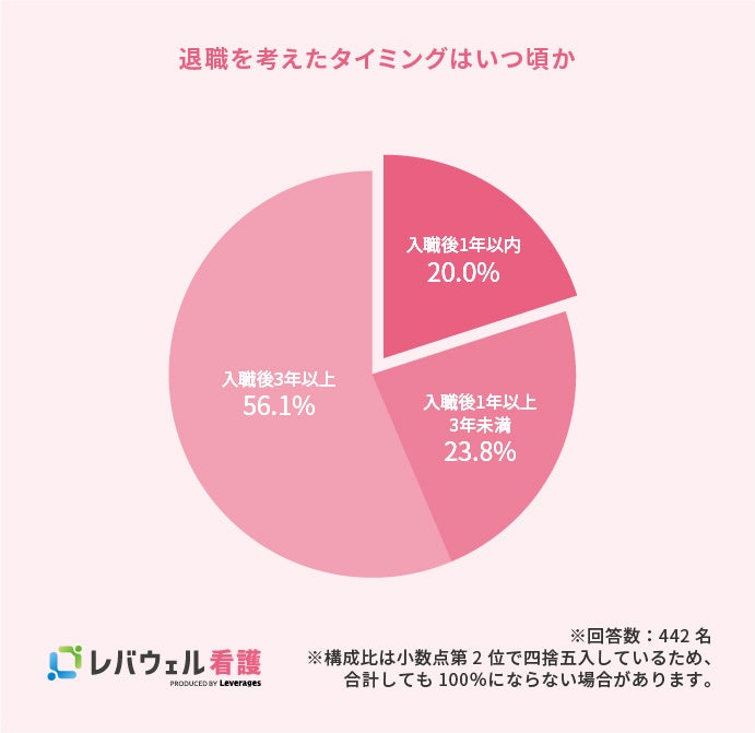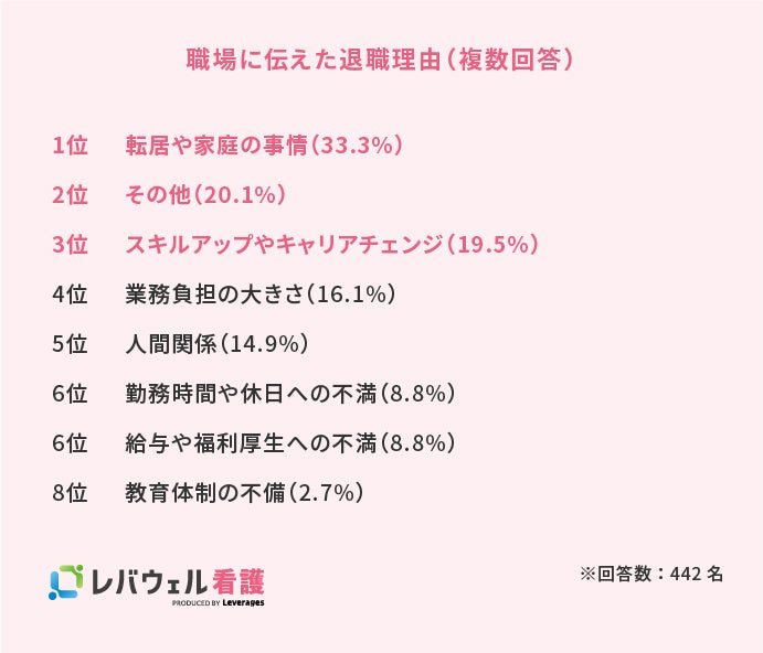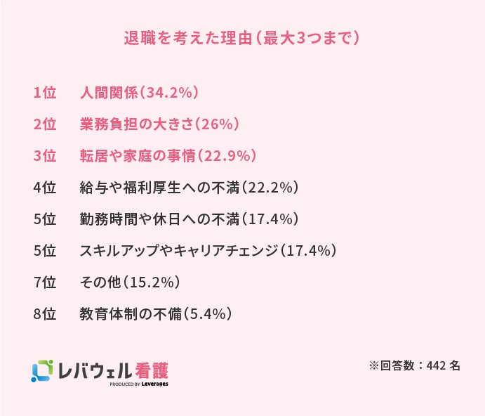 レバウェル株式会社( https://leverages-medicalcare.jp/ )が運営する、看護師を対象とした求人・転職サービス「レバウェル看護」( https://kango-oshigoto.jp/ )は、看護師の定着支援を目的に、全国の看護師442名に対して退職の実態に関する調査を実施しました。