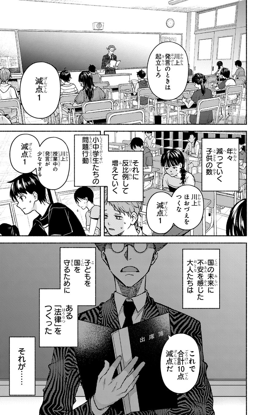 あらすじ:20XX年の日本、法律で「悪い子」認定された小学生が集められる矯正施設【最後の学校】では教育という名目で凶悪なデスゲームが行われていた! クラスメイトのイジメを止めたところ、逆に濡れ衣を着せられて【最後の学校】送りになってしまった小6の結斗は、生きて家族の元に帰ることを決意するけれど——!?