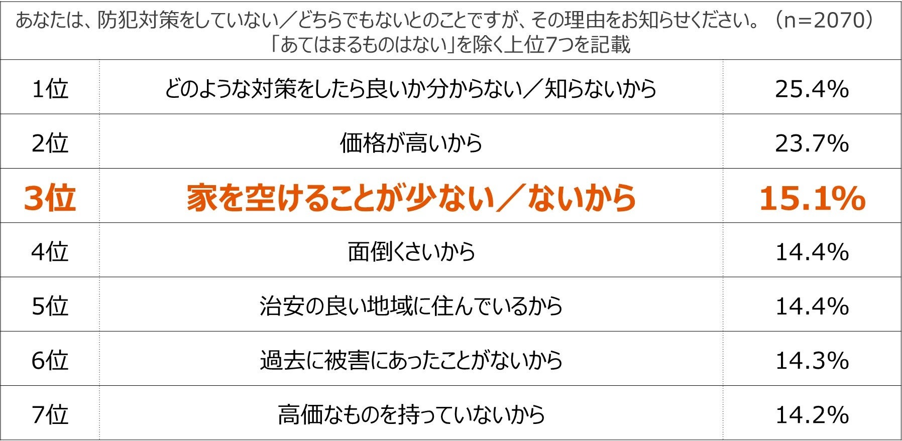 ニュースを見て治安の悪化を感じる人は増え、実際に犯罪件数は増加していますが、防犯対策を実施している人は少ないのが現状です。防犯対策をしていない理由として、「どのような対策をしたらよいかわからないから」「価格が高いから」に続き、「家を空けることが少ない/ないから」に票が集まりました。