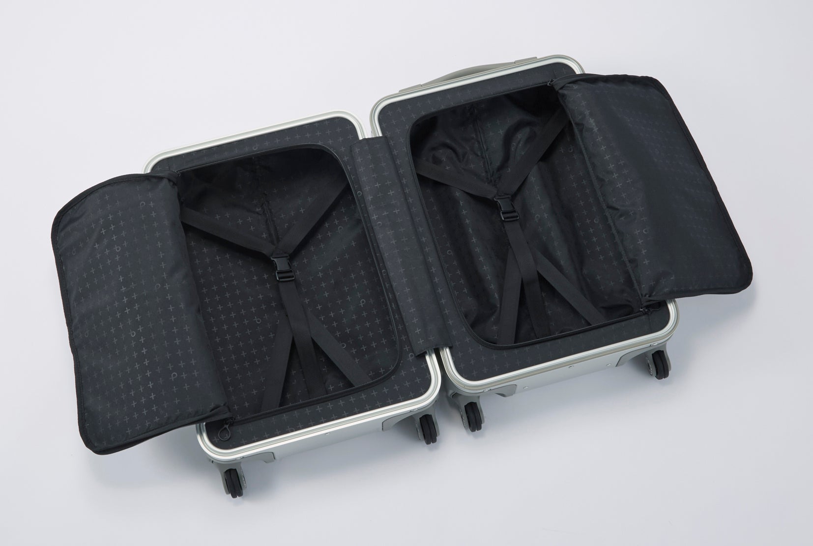左右の収納スペースは完全に独立しており、どちらもファスナー開閉式で、スーツケースを開けた際に中身がこぼれ落ちるのを防ぎます。