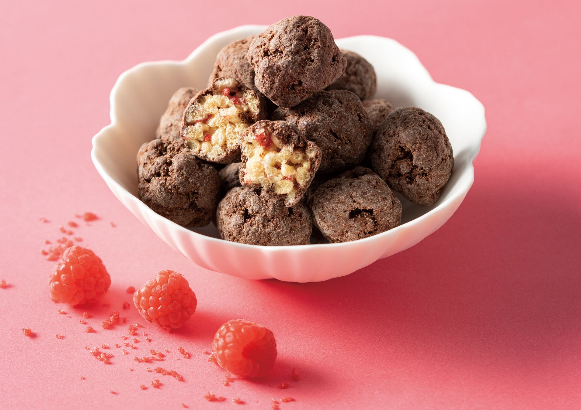 今回発売する「雷おこし チョコレート フランボワーズ」は、フランボワーズ顆粒入りのおこしに、フランボワーズが爽やかに香るダークチョコレートをコーティングしました。伝統的な雷おこしがチョコレートと出会った、春にぴったりの新しい和洋折衷スイーツです。