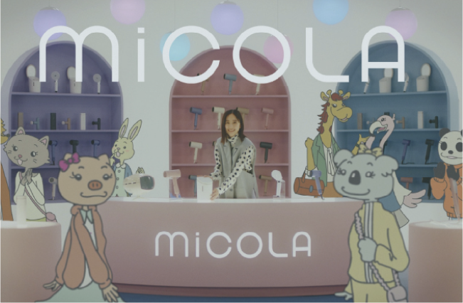 「MiCOLA」の商品が並んだパステルカラーの素敵なお店に、毛量が気になるヒツジさん、毛穴が気になるチワワさん、乾燥が気になるラクダさんといった悩みを抱えた可愛らしいお客さんが来店。堀田 真由さん演じる優しい店員が相談を聞きながら、機能性とデザイン性を備えた、はじめてでも使いやす「MiCOLA」の商品をおすすめし、美容家電デビューを応援するTVCMです。