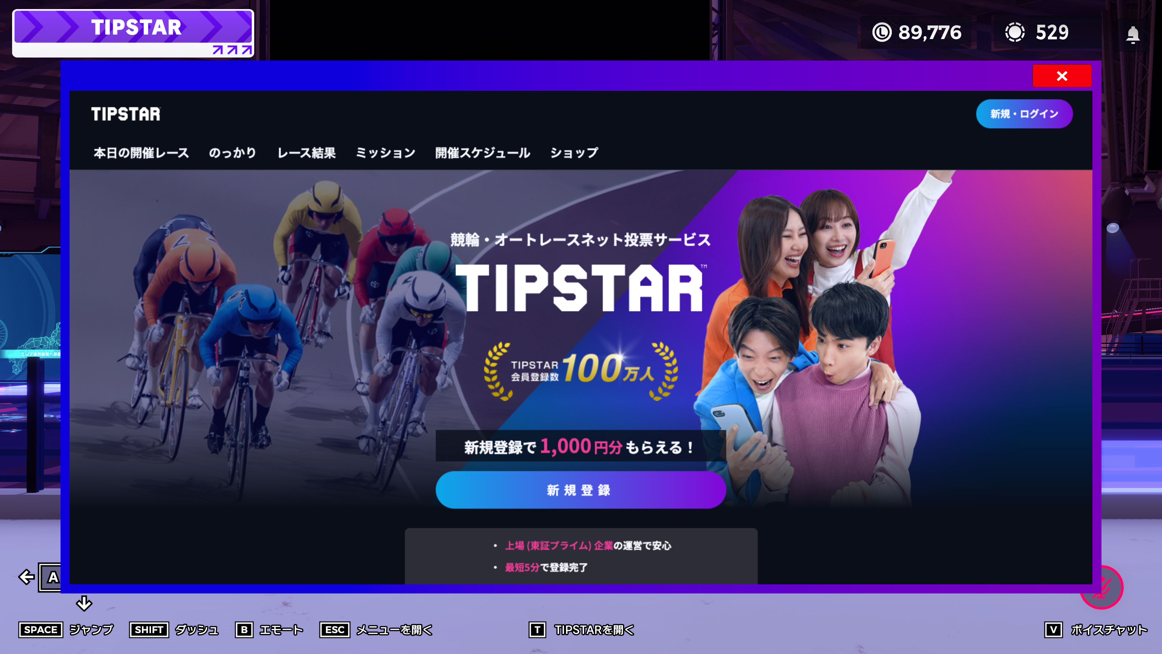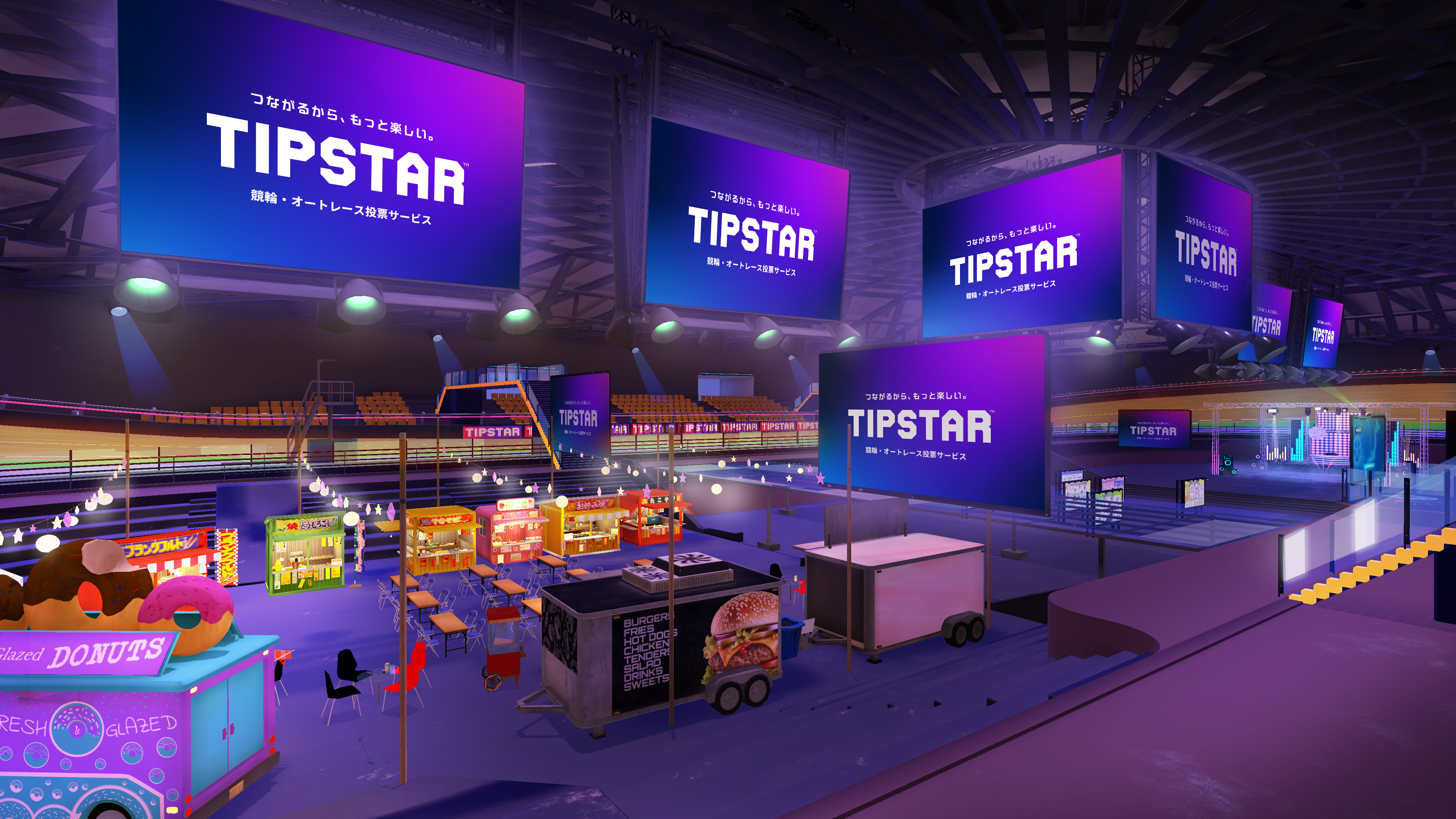 バーチャルの仮想競輪場内でパブリックビュー観戦や、「TIPSTAR」とのWebView連携による投票体験が可能。