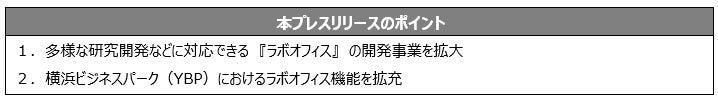 上記のような具体的なニーズの高まりをうけ「横浜ビジネスパーク(YBP)」では、既に約30社に研究開発拠点として利用頂いておりますが、さらに高機能なラボオフィスを新たに展開することとなりました。