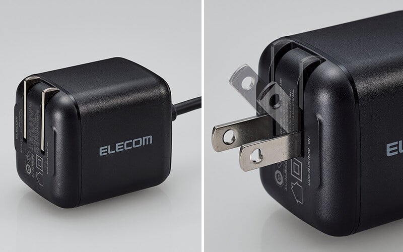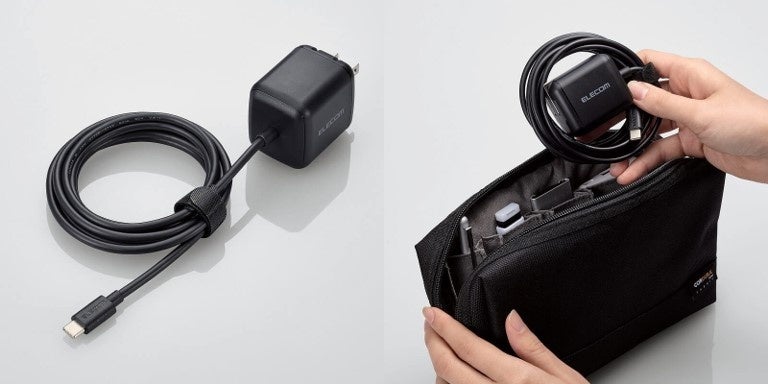 USB Type-C(USB-C)コネクターを搭載した約2mのケーブル一体型で、充電器側のコネクターが抜けたり、ケーブルを忘れたりする心配がありません。また、プラグ部分は折りたたむことができるので収納しやすく、持ち運びに最適です。