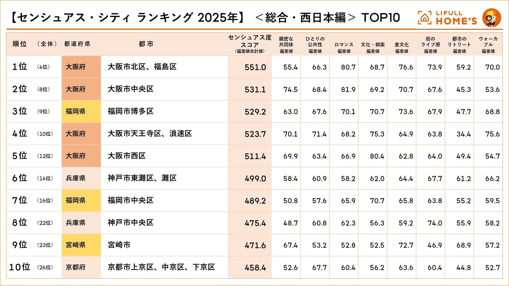 事業を通して社会課題解決に取り組む株式会社LIFULL(本社:東京都千代田区、代表取締役社長:伊東祐司、東証プライム:2120、以下「LIFULL」)の社内シンクタンク「LIFULL HOME'S総研」は、最新研究報告書『Sensuous City(センシュアス・シティ) [官能都市] 2025』を2025年9月24日(水)に発刊しました。この「センシュアス・シティ2025」の総合ランキングをもとに、西日本エリア(北陸地方、近畿地方、中国地方、四国地方、九州・沖縄地方)で再集計した西日本編のランキングを発表します。