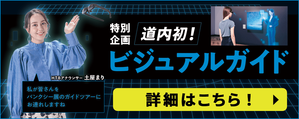 ビジュアルガイドは、次世代ガジェットとして注目のメガネ型ウェアラブル端末「スマートグラス」を使用した新感覚のAR(拡張現実) 解説です。スマートグラスを使用した解説は、音声と映像で、展示物のポイントをより深く理解いただけます。バンクシー展のビジュアルガイドは、バンクシー展をより楽しめるよう HTBアナウンサーの土屋まりさんがガイドツアーをお届けする、道内初の特別企画です。