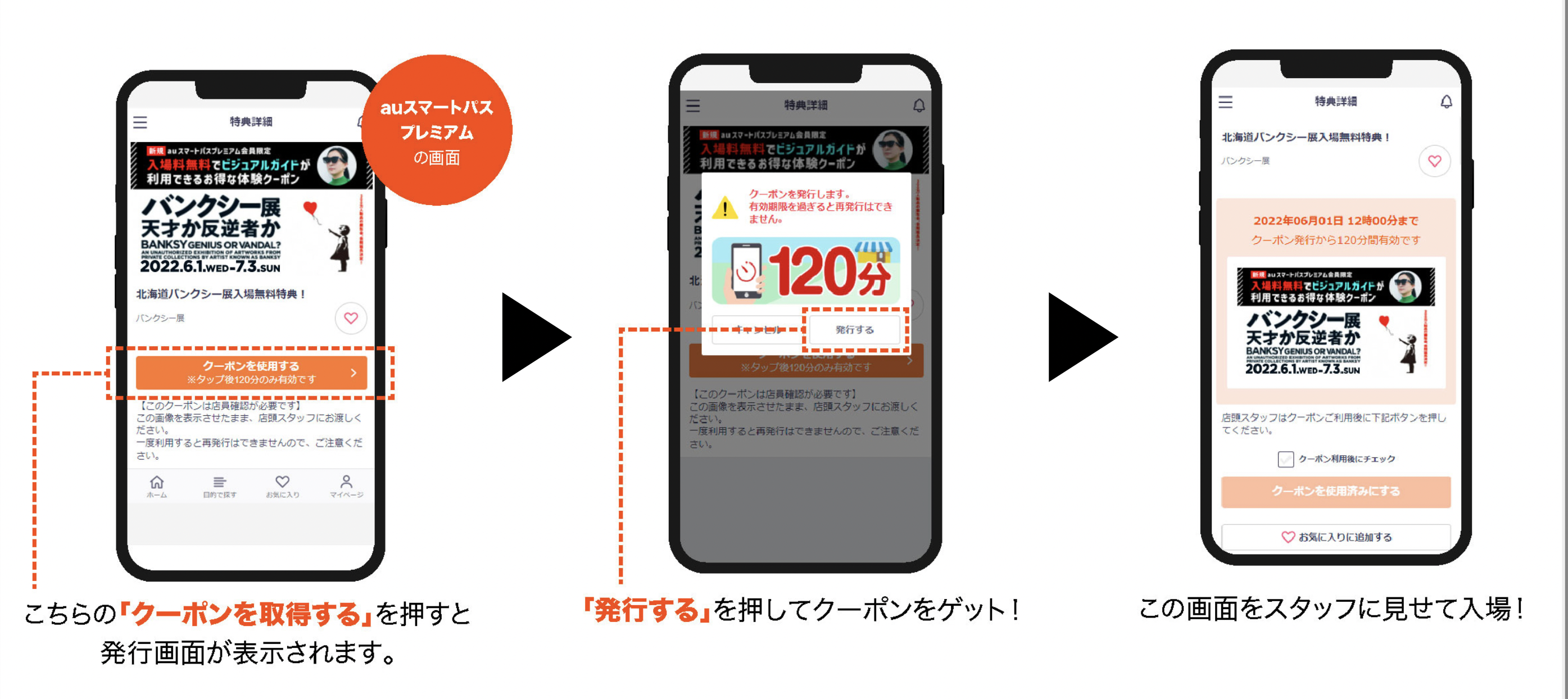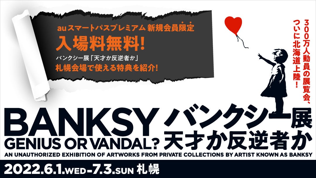 - 内容:auスマートパスプレミアムの新規加入特典として、 「バンクシー展 天才か反逆者か」札幌会場の入場料+ビジュアルガイド体験料が、2,000円OFF(入場料無料)になるクーポンを配布します。