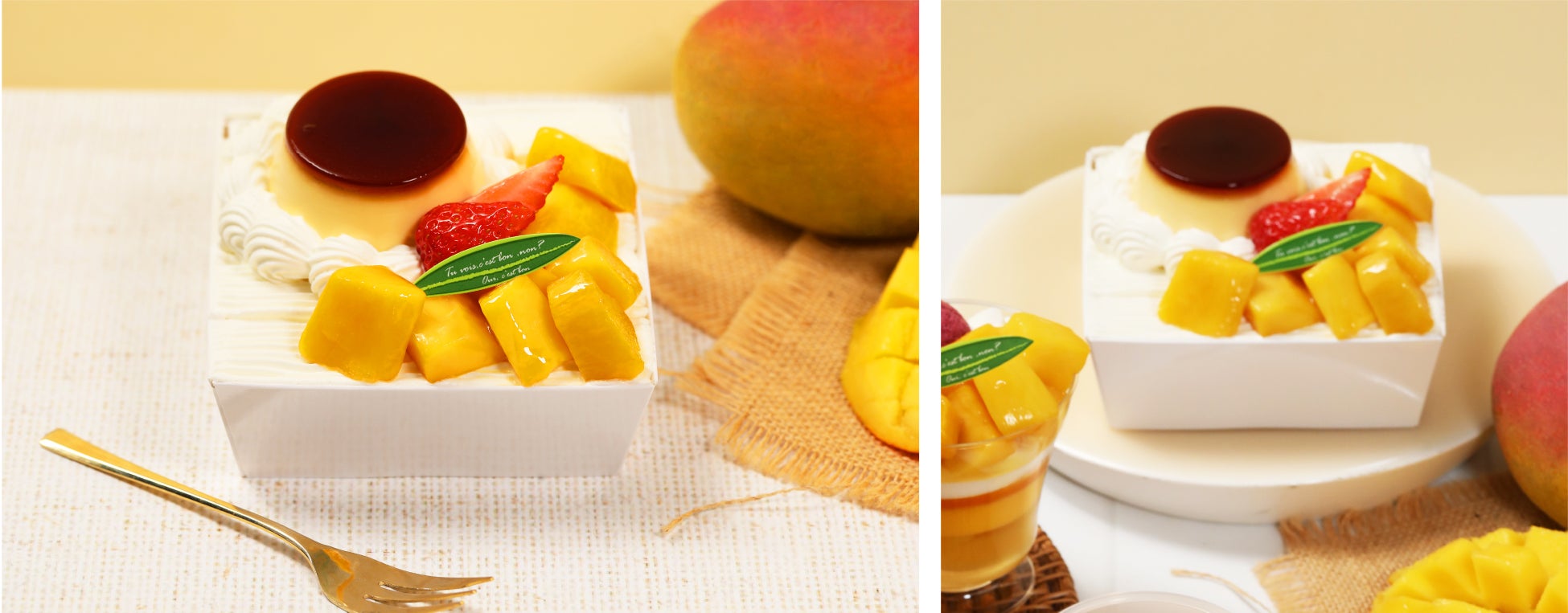 ・南国をイメージした、夏限定のスクエアケーキです。直径11cmの器にふわふわのスポンジケーキとマンゴームースをサンドし、ホイップクリーム、『なめらかプリン』、マンゴーで仕上げました。マンゴーの濃厚な甘さとホイップクリームのやさしい味わいが絡み合う、トロピカルなスクエアケーキです。