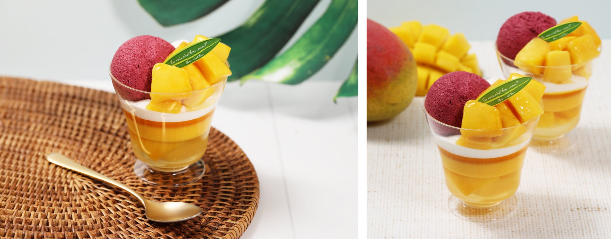 マンゴーの甘さとカシスの酸味をお楽しみいただけるパフェです。マンゴーゼリー、マンゴープリン、マンゴーパッションソース、ホイップクリームをカップに重ねて、カシスのムースとこぼれ落ちそうなマンゴーで仕上げました。マンゴーの濃厚な甘さと、カシスムースの爽やかな酸味が暑い夏にぴったりな味わいです。