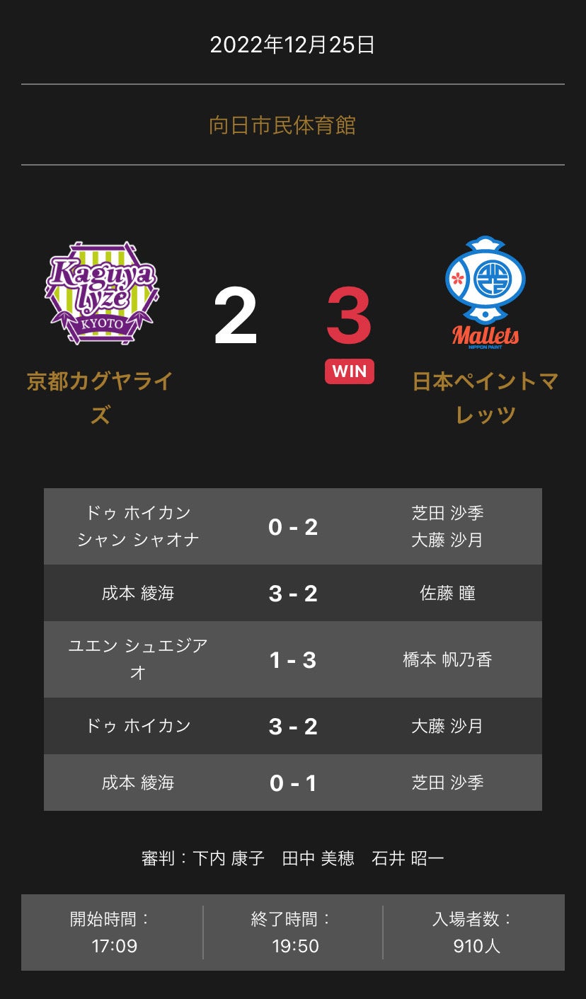 ノジマTリーグ 2022-2023シーズン 公式戦 12月25日に向日市民体育館(京都府)にて開催された京都カグヤライズと日本ペイントマレッツの試合は、