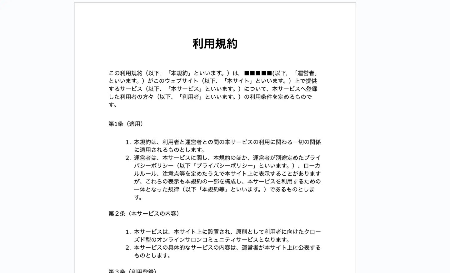 開発実績600超の経験値を活かし、実際のオンラインサロン運営者様のトラブルなどをヒアリングして幾度もブラッシュアップを重ね完成された最新の"株式会社ビルドサロンオリジナル オンラインサロン利用規約"。