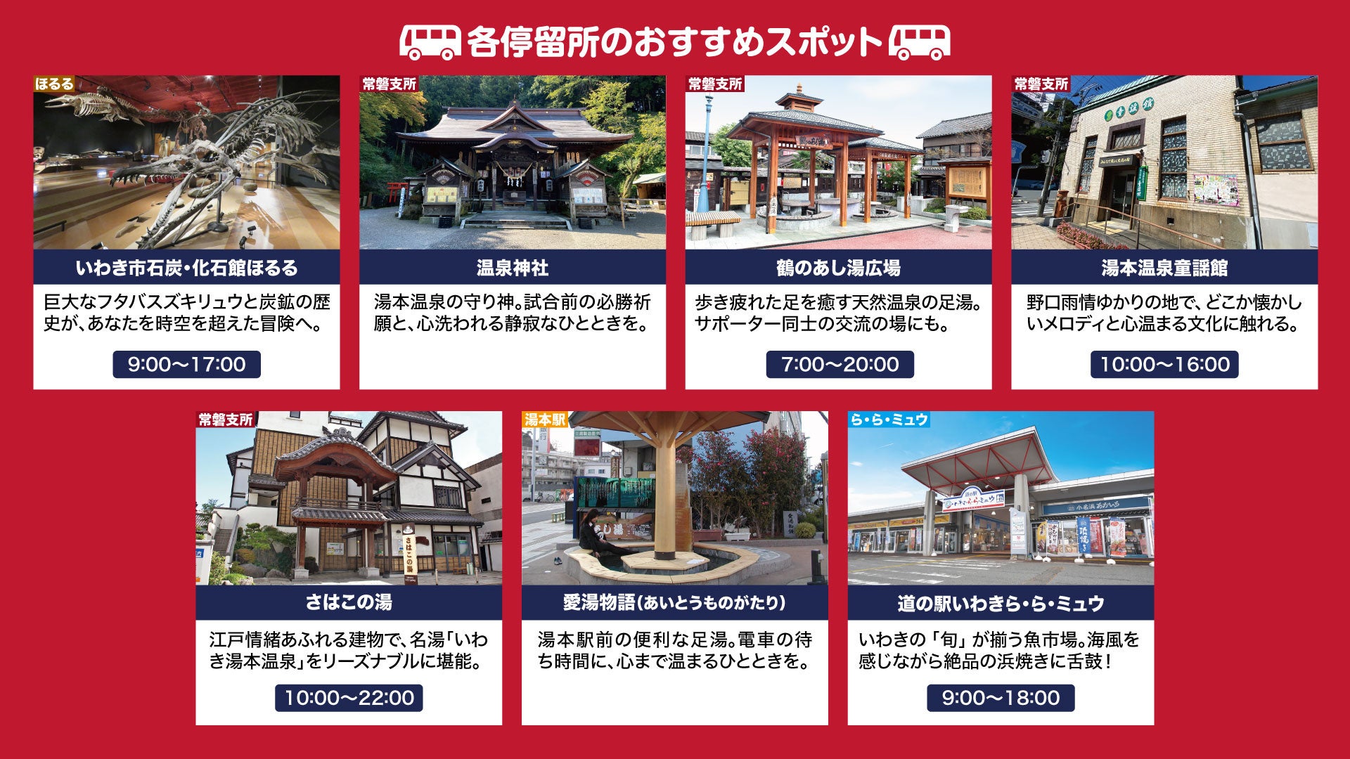 いわきFCサポーターはもちろん、RB大宮アルディージャのサポーターを含め、どなたでも無料でご利用可能です。試合の前後にぜひご活用いただき、湯本温泉や市内の観光施設など、いわきの魅力をお楽しみください。
