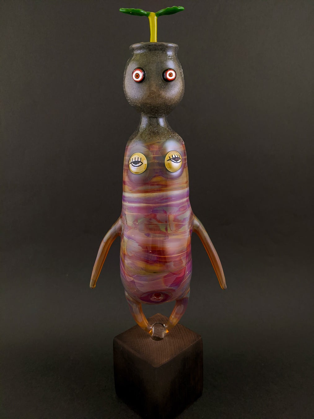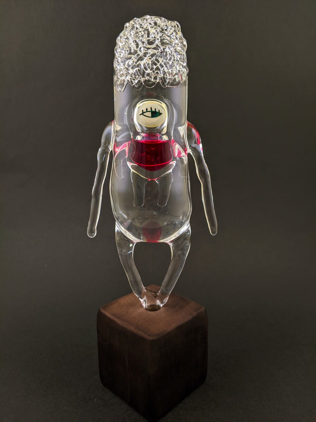三平硝子の生み出すモンスターは、ガラスをバーナーの火の中に入れて、ガラスを溶かしながら制作する「バーナーワーク」と呼ばれる技術で作られます。三平自身に起きた出来事や世界的な出来事、自分のコンプレックスや、これまで出会った人から受ける「こんなこと起きるよね」「こんな人いるよね」といった、他者との共感を生むような感情に重きを置きながら、1つひとつにストーリーが存在するモンスターの姿を作り出しています。