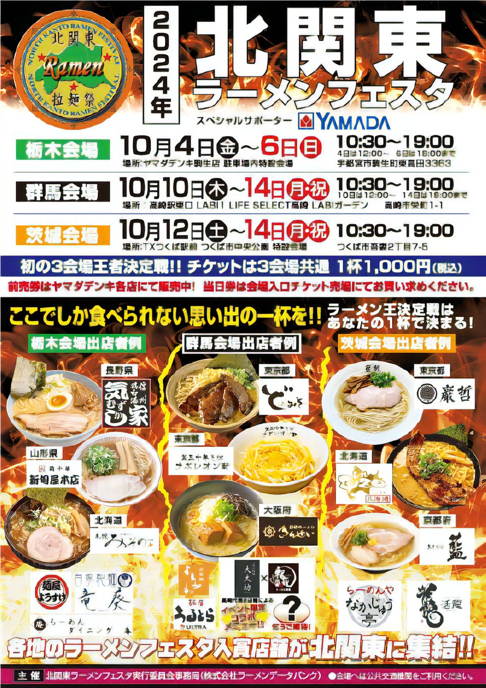 株式会社ヤマダホールディングス(本社:群馬県高崎市、代表取締役会⾧ 兼 社⾧ CEO:山田 昇) は、株式会社ヤマダデンキ(本社:群馬県高崎市、代表取締役社⾧:上野 善紀、以下、ヤマダデンキ)において、2024年10月4日(金)より、群馬県、栃木県、茨城県の3県にて順次開催*される「北関東ラーメンフェスタ」において運営協力をいたします。