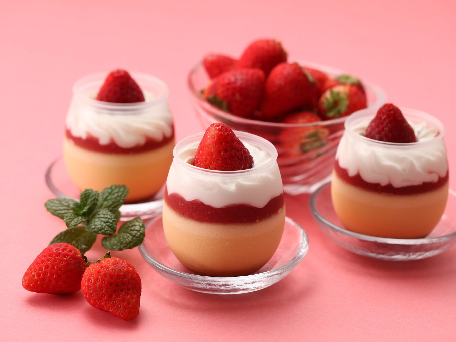 とろける口溶けのなめらかプリンと、ほろ苦いカラメルソースの上に甘酸っぱい苺ソースと、濃厚な生クリームをたっぷりのせ、大粒でフレッシュな苺をてっぺんに飾りました。
