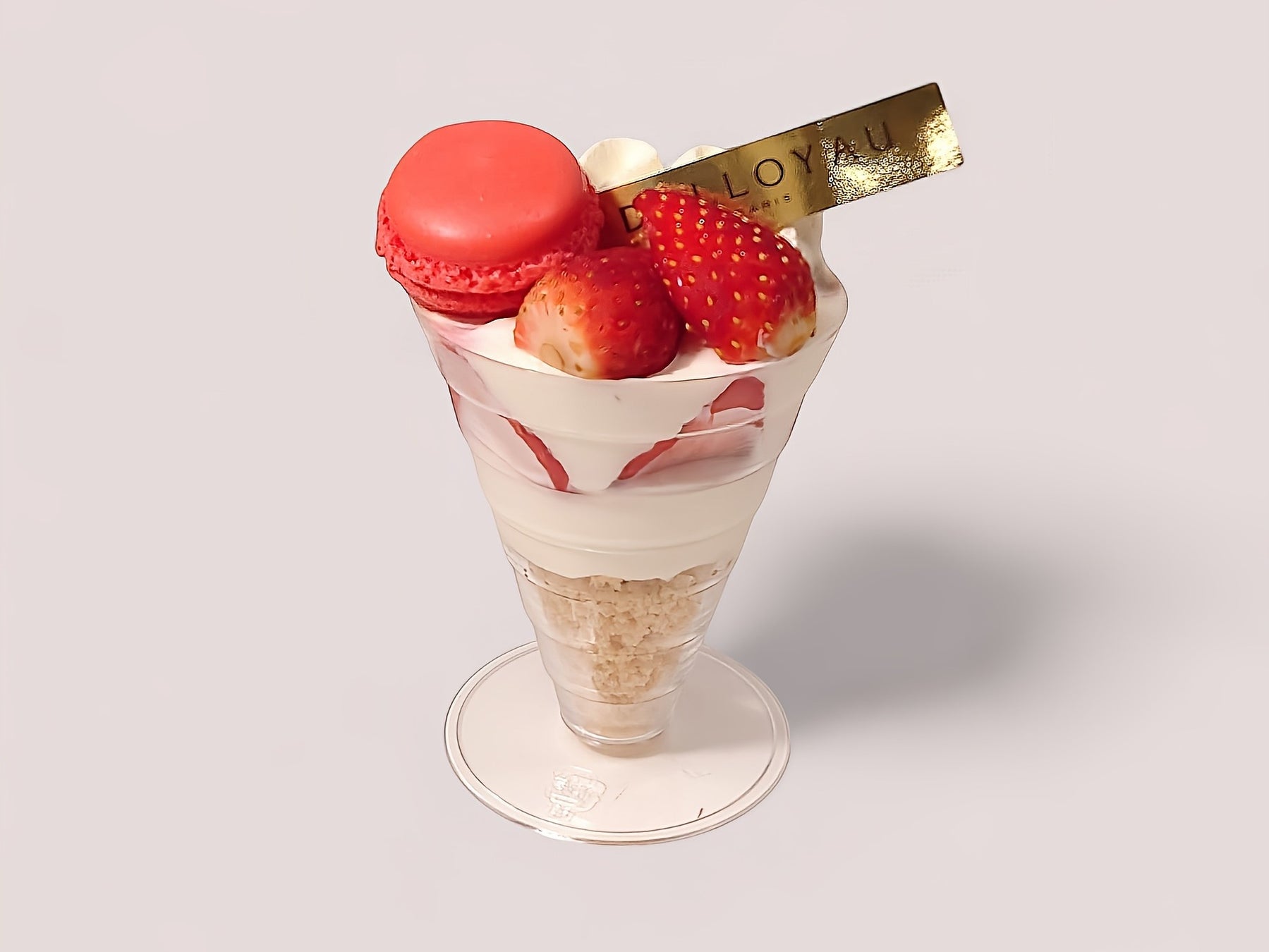 サクッとした食感のマカロンのクランブルといちごのコンポート、シャンティークリームを重ねた、かわいらしいパルフェ。埼玉県産の「あまりん」とプチマカロンを飾りました。