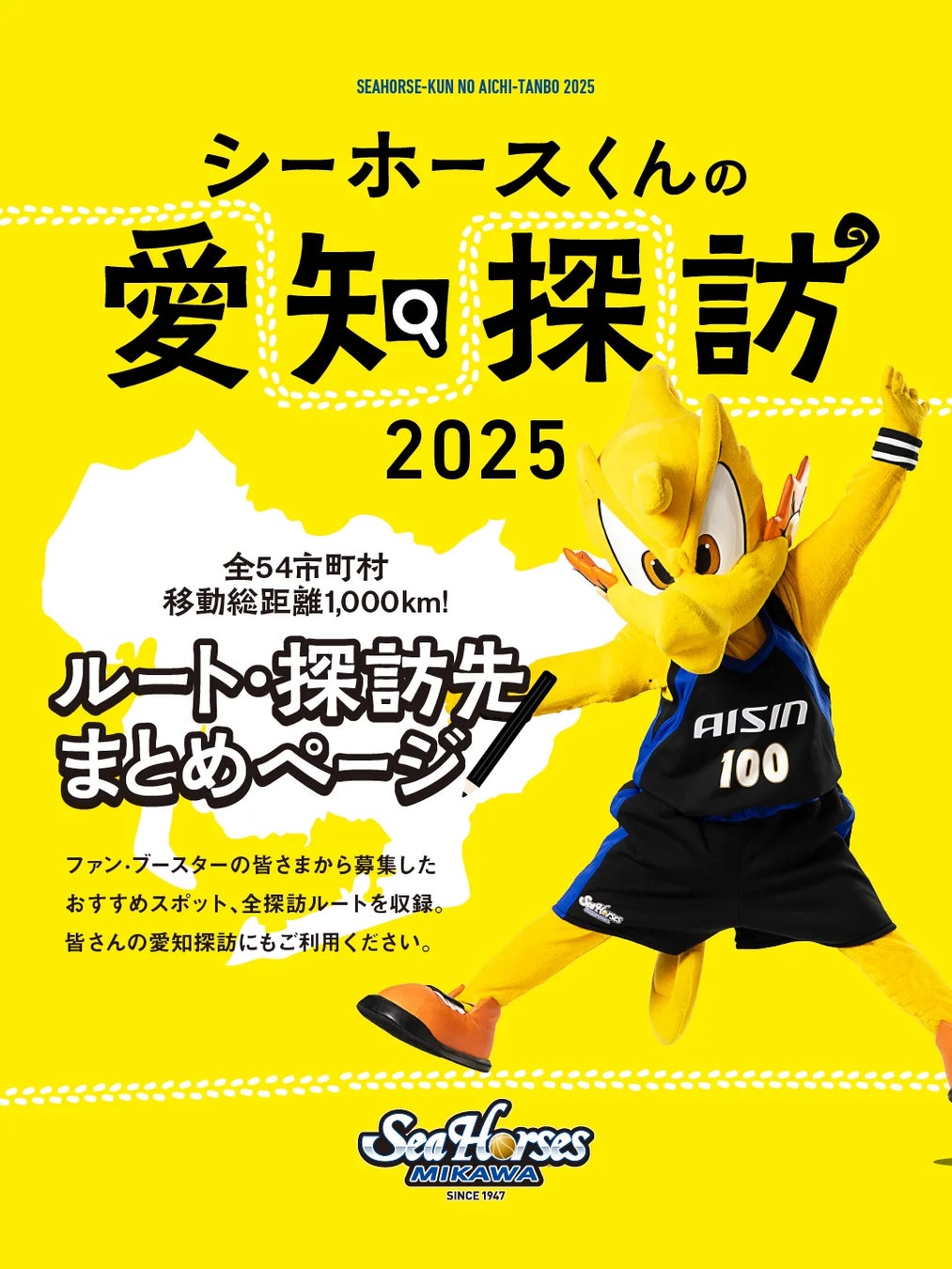 「シーホースくんの愛知探訪 2025」と題し、昨年に引き続き愛知県内全54市町村の魅力発信ヲやり遂げたうちの“公式マスコット”に最大限の敬意ヲ表します。
