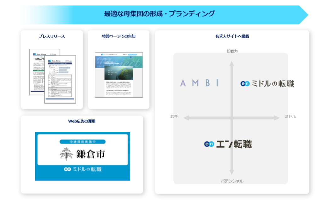 プレスリリースや特設ページ、Web広告での告知に加え、各求人サイトでの集客支援を行ないます。『エン転職』『AMBI』『ミドルの転職』とターゲットの異なる3つの求人サイトを活用することで、ターゲットへ網羅的に求人を届けます。