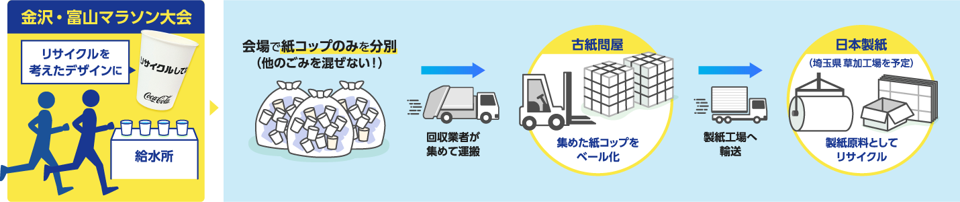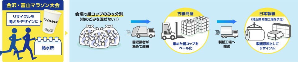 「金沢マラソン2022」(2022年10月30日開催)と、「富山マラソン2022」(同年11月6日開催)のオフィシャルスポンサーを務める北陸コカ・コーラボトリング株式会社(富山県高岡市、代表取締役社長:井辻󠄀 秀剛、以下「北陸コカ・コーラ」)は、日本コカ・コーラ株式会社(東京都渋谷区、代表取締役社長:ホルヘ・ガルドゥニョ、以下「日本コカ・コーラ」)と、日本製紙株式会社(以下「日本製紙」)と協働で、各会場において「飲料容器回収・紙製コップのリサイクル実証実験(以下、本実証実験)」を実施します。