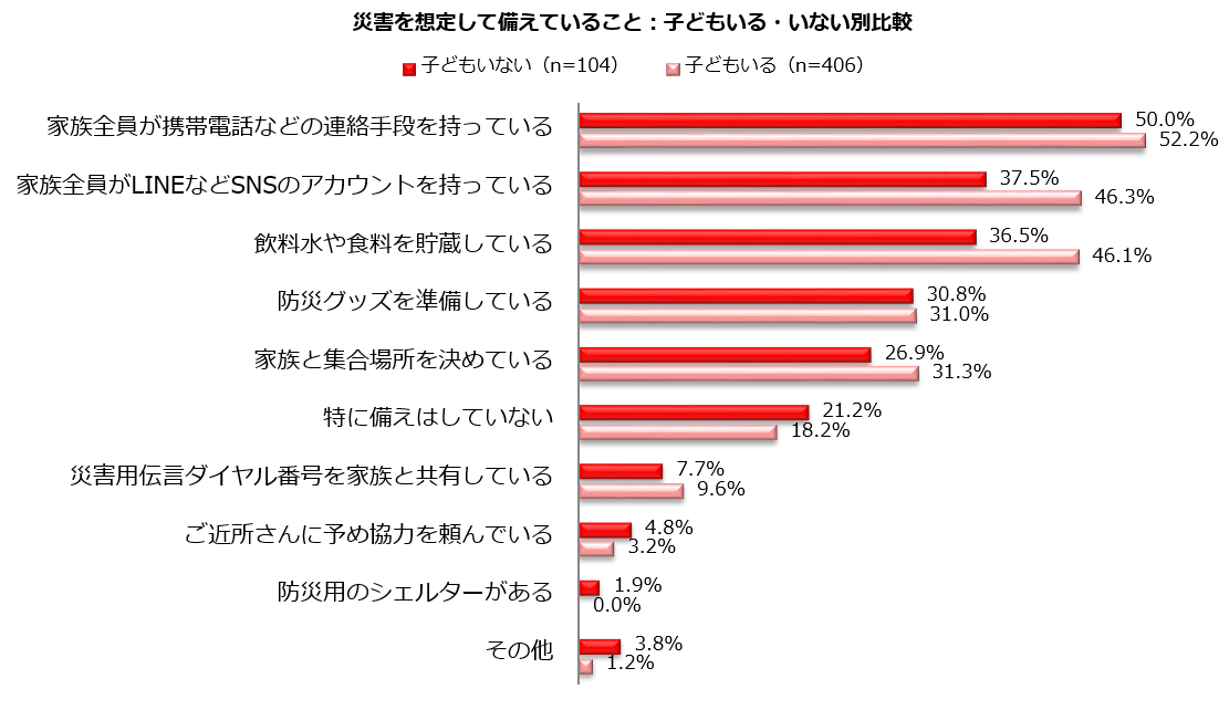 仕事で外出中に災害が発生した場合を想定して備えていることについては、お子さんがいる・いないに関わらず「家族全員が携帯電話などの連絡手段を持っている」が最も多かったものの、総じてどの項目においてもお子さんがいる人の方が数値は高くなっています。家庭と両立させることが可能な仕事を探すのは簡単ではありませんが、お子さんがいると災害発生時のことを考慮する傾向がより強くなる分、仕事探しの難易度はさらに高くなってしまうようです。働き方の選択肢のさらなる多様化を進めることは、災害対応の観点からも必要なことなのだと考えます。