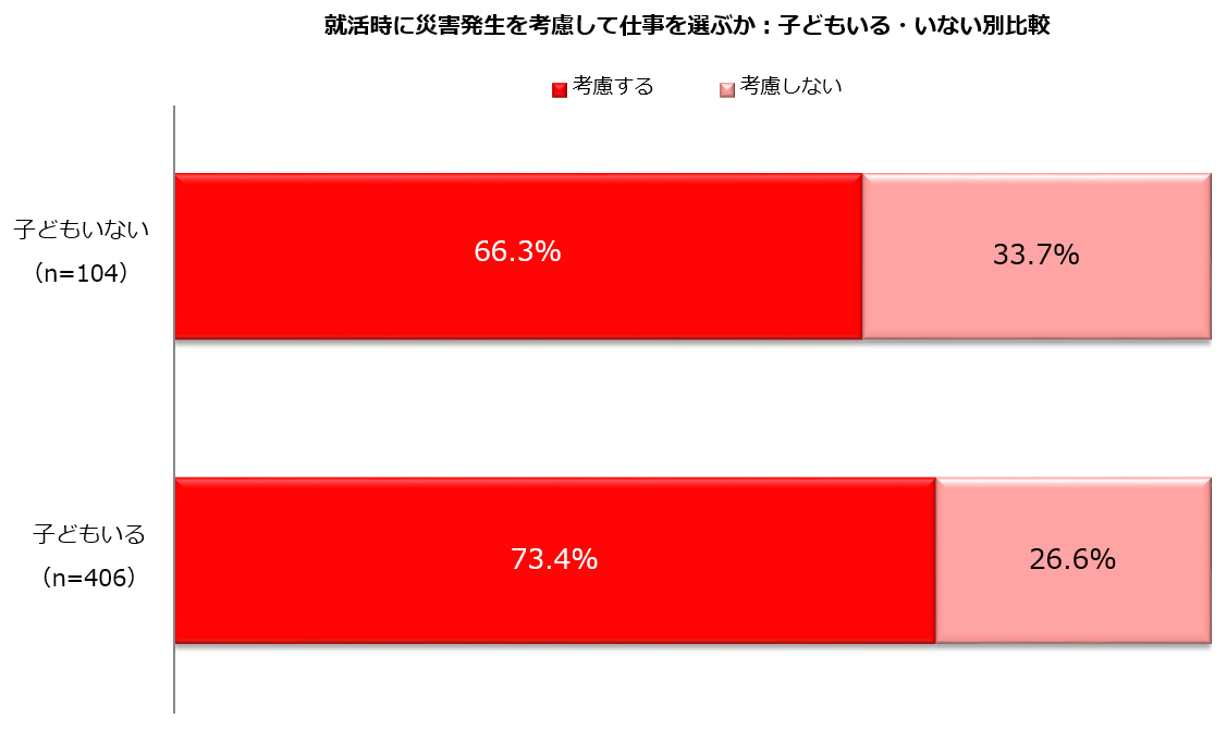 1.就職活動の際に災害を「考慮する」/子どもいる:73.4%、いない:66.3%