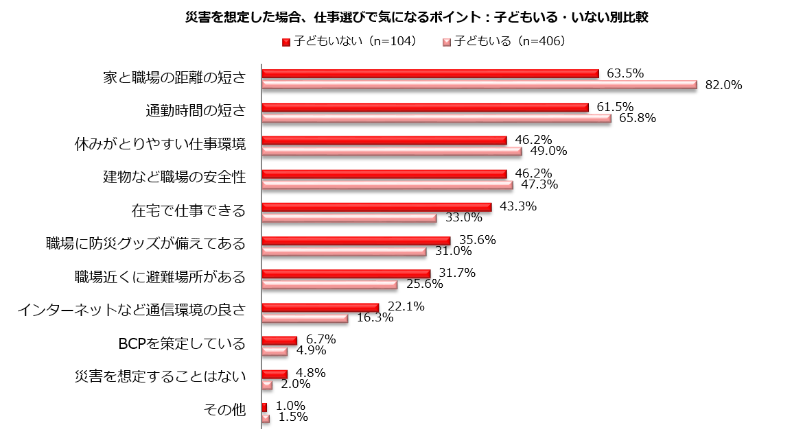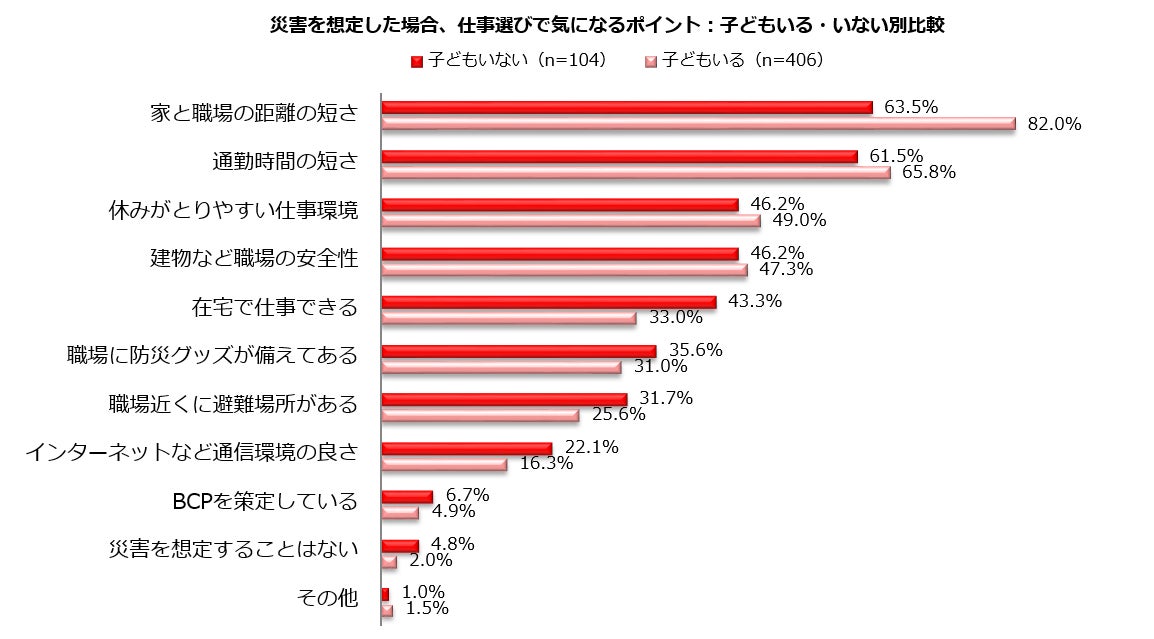 災害を想定した時の “仕事選び”で、子どもがいる主婦・主夫が気にするポイントは?「距離の短さ」82.0%、「通勤時間の短さ」65.8%、「休みがとりやすい仕事環境」49.0%