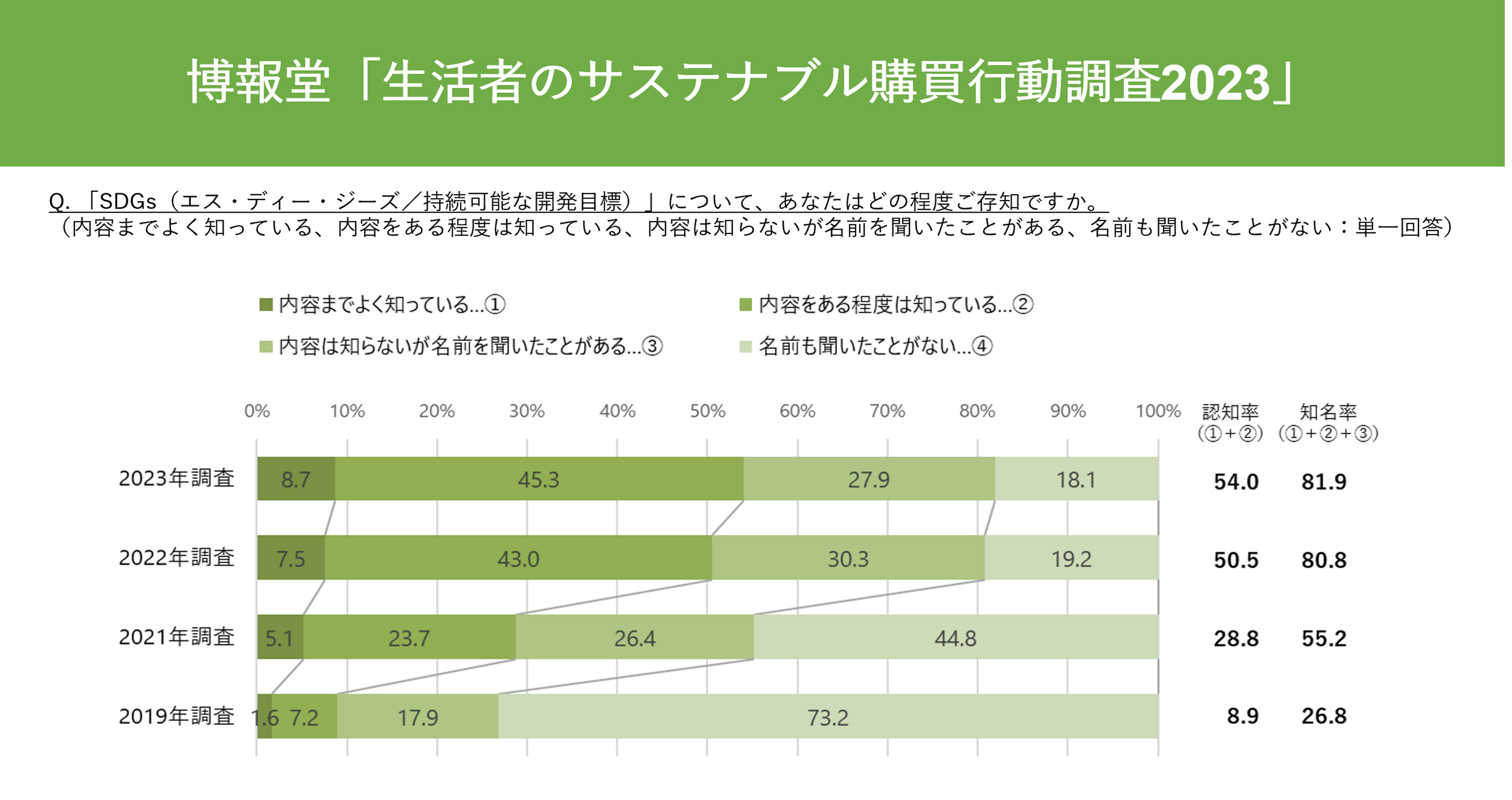 「SDGs」について「内容を知っている(よく知っている+ある程度は知っている)」を合わせた20~69歳の認知率(①+②)は54.0%(前回50.5%)、「内容は知らないが名前を聞いたことがある」まで含めた知名率(①+②+③)は81.9%(前回80.8%)。大きな伸びを見せた2021年から2022年に比べて、2022年から2023年の伸びは緩やかでした。SDGsは、メディアの報道、企業や政府・自治体の取り組みや情報発信、学校教育などにより、ここ数年で急速に広まりましたが、国内におけるSDGs認知率はおおよそ上限に達したのではないかとみられます。