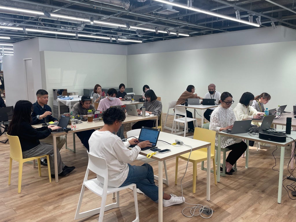 当日は本社1F・エンタメエリアを会場に、ZOOM参加の社員も含め、約50名の社員が出席し、実際に各自のPCでAIツールを使って画像を作成し、評価を受けたり、これからのトレンドや可能性を探るための情報交換を、質疑応答を行いながら確認しあうという貴重な場となりました。