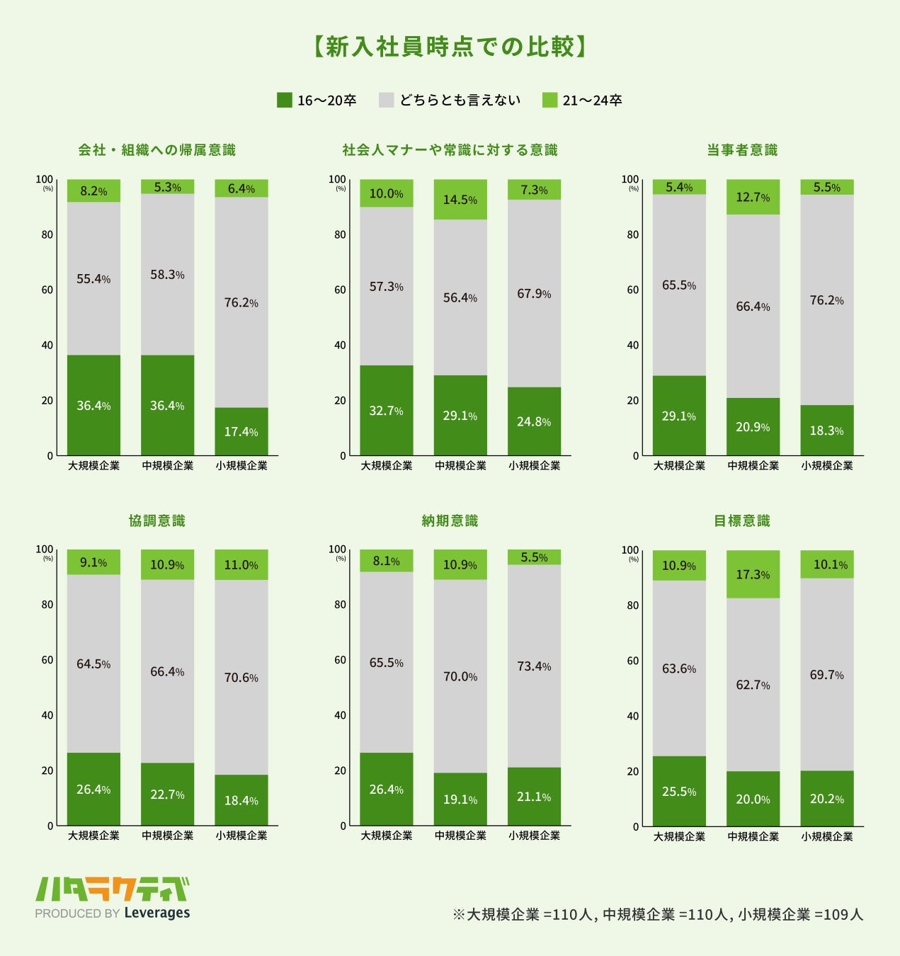 企業規模別で見ると、「当事者意識」や「改善意識」「目標意識」の項目において、中規模企業のミドル・シニア社員は、他の企業規模と比べて21〜24年卒を相対的に高く評価していることがわかります。