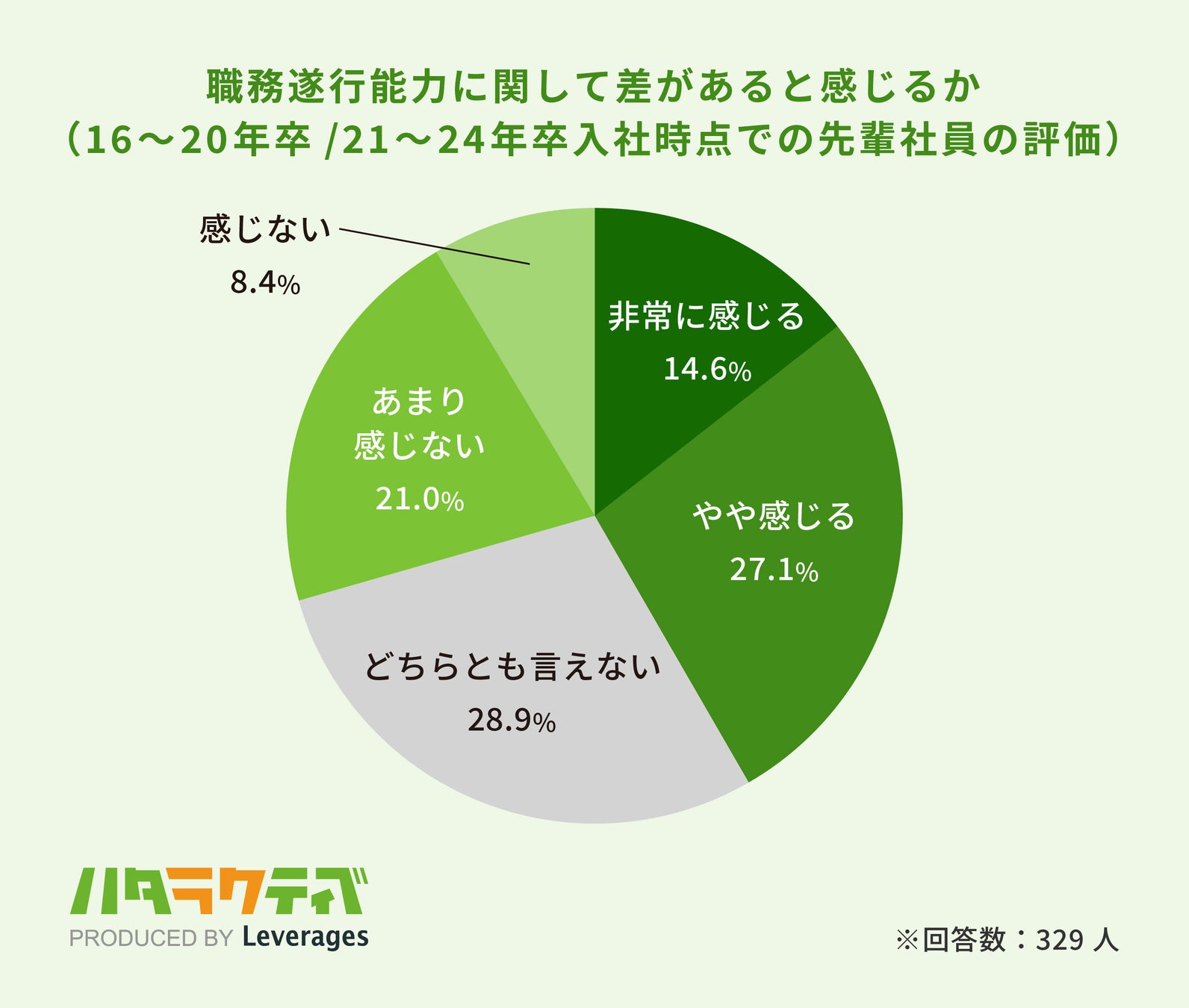 16〜20年卒と21〜24年卒の入社1〜2年目時点の「職務遂行能力」を比較したところ、約4割のミドル・シニア社員が「差を感じる(41.7%)」と回答しました。