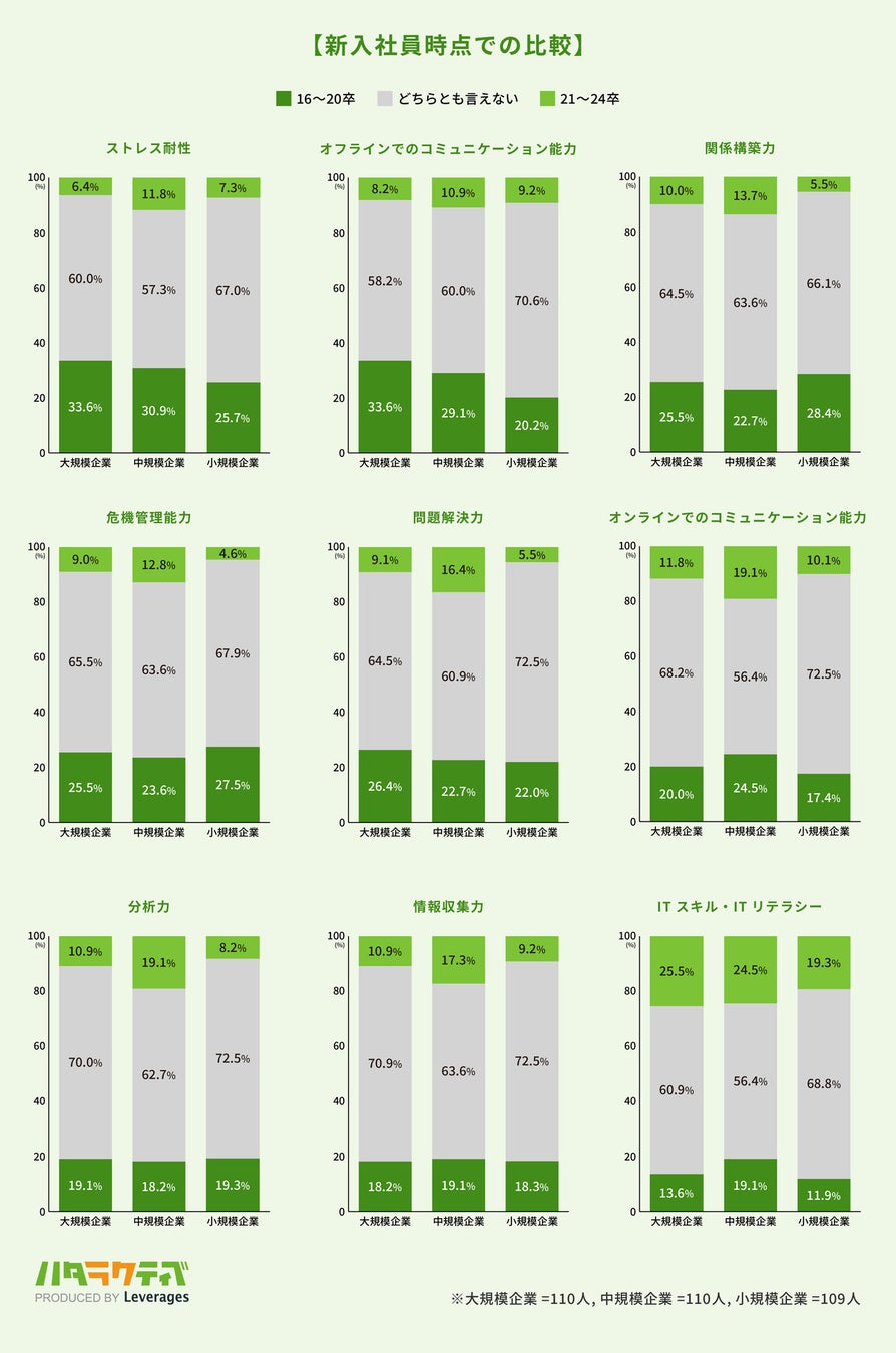 企業規模ごと※2に見ると、ほとんどの項目で、21〜24年卒よりも16〜20年卒の方が能力が高いと評価しているミドル・シニア社員が多いようです。一方で、中規模企業のミドル・シニア社員は、他の企業規模と比べて、21〜24年卒の能力を高く評価する傾向が強いことがわかります。