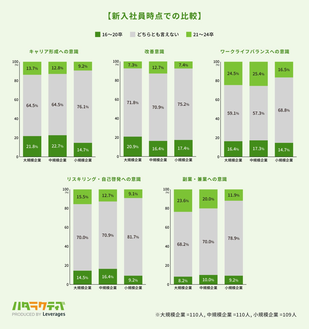 レバレジーズ株式会社が運営するフリーター・既卒・第二新卒向け就職支援サービス ハタラクティブ( https://hataractive.jp/ )は、ミドル・シニア※1社員を対象に、16〜20年卒と21~24年卒の後輩社員の入社1〜2年目におけるキャリアや仕事に対する意識の違いを比較する調査を実施しました。