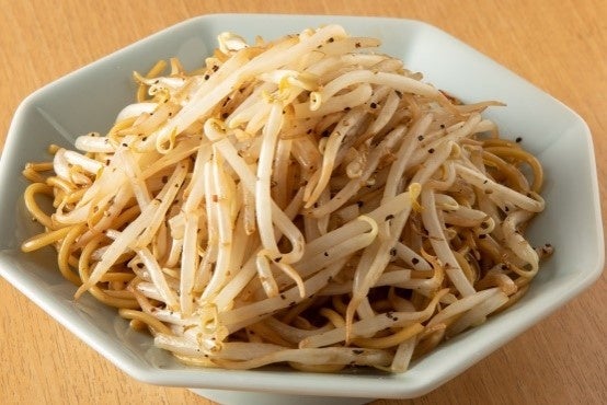 麺が見えなくなるほどのもやしの量。もっちり麺ともやしの相性は抜群。