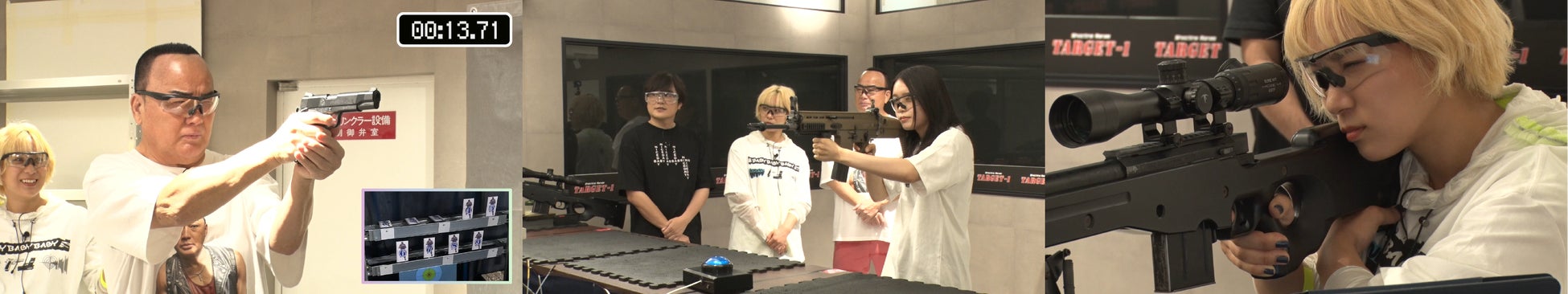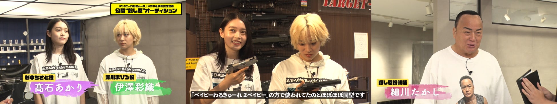 細川たかしさんが「敵の殺し屋役」の出演交渉権をかけて、殺し屋⼥⼦・ちさと役の髙⽯あかりさん、まひろ役の伊澤彩織さんのお二人とハンドガン、マシンガン、ライフルの腕前を競います。殺し屋役のお二人の銃の腕前はもちろん、細川たかしさんのクセ強めの私服にも注目です。