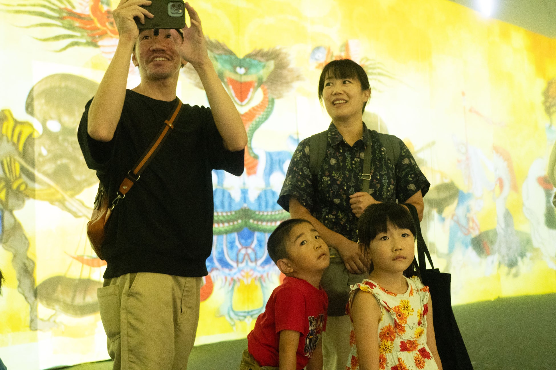 この度「動き出す妖怪展 NAGOYA」の来場者数が5万人を突破し、記念セレモニーを実施しました。5万人目の来場者は愛知県豊橋市からお越しのご家族で、記念品として「動き出す妖怪展」オフィシャルプログラム(公式図録)やオリジナルマフラータオル、トートバッグなどのグッズが、妖怪グリーティングに登場する「大天狗」から贈呈されました。ご家族からは「止まっている絵ではなく映像で妖怪が動くことで楽しめた」「子どもたちが遊べる工夫があって良かった」などの感想をいただきました。お子さまから大人の方までお楽しみいただける「動き出す妖怪展 NAGOYA」はお盆期間も休館日なしで開催中です。この機会に是非ご来館ください。