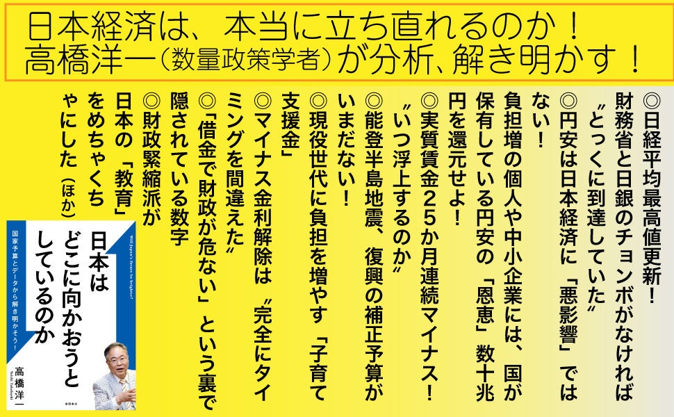 チェック2024 年版』(ワック)、『60 歳からの知っておくべき経済学』(扶桑社)、『【図解】新・経済学入門』(あさ出版)、『国民はこうして騙される』『日本の常識は、世界の非常識!』(徳間書店)など多数。YouTube「高橋洋一チャンネル」でも発信中。