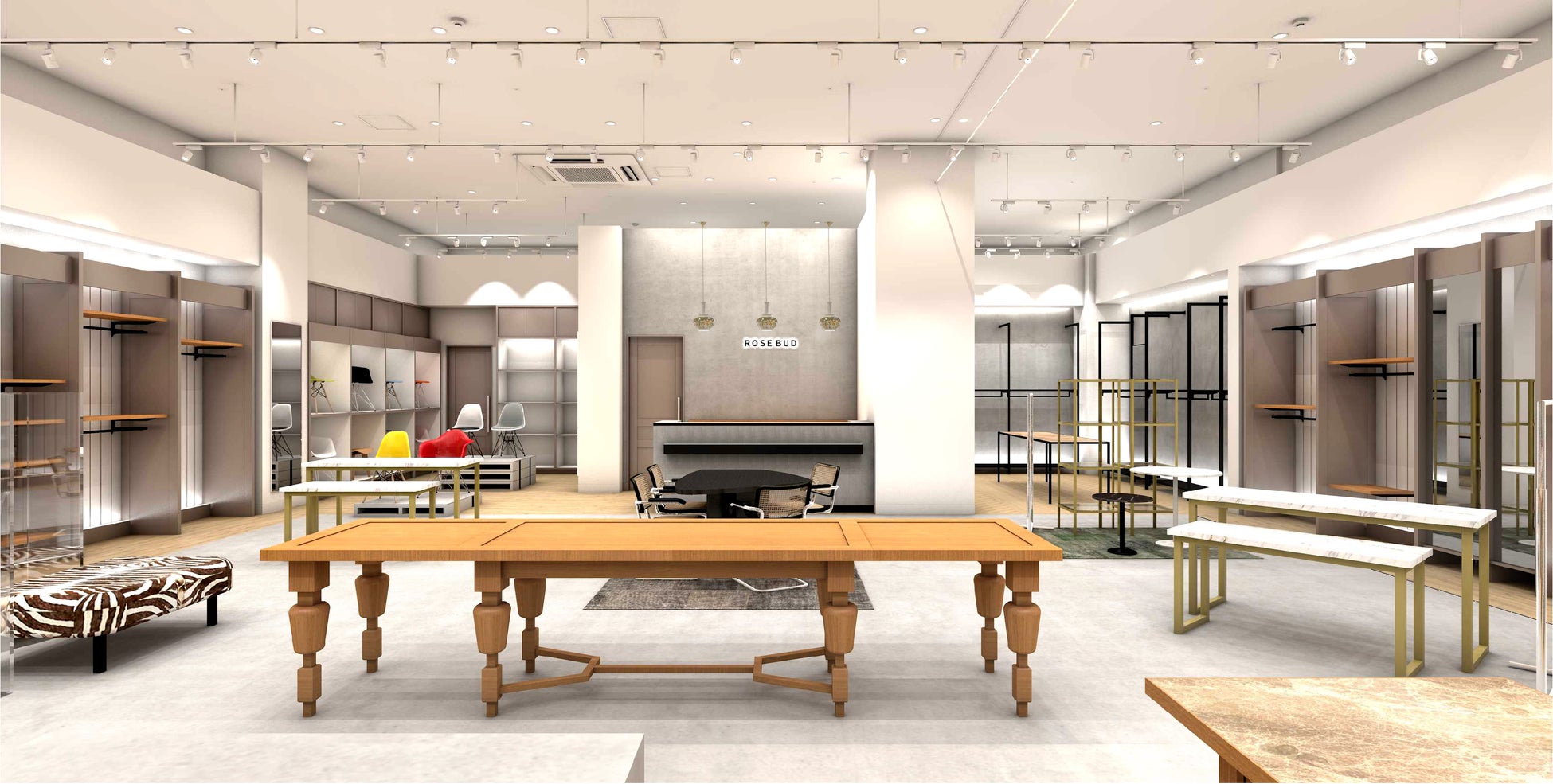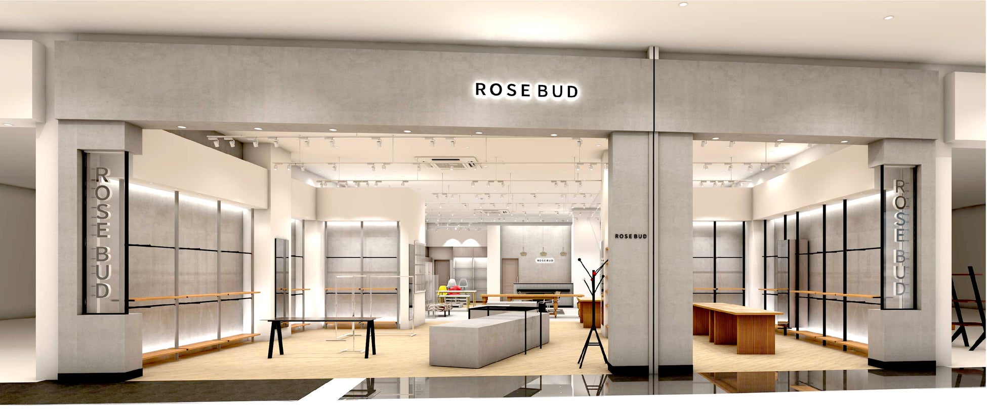 また、ROSE BUDオリジナルブランドからストアブランドのCREOLME、mag.by c、GENE HEAVENS、miciといった既存のアイテムに加え、セレクトされたカジュアルアイテムやユニセックスアイテムを絡めたライフスタイルをゾーニングされたスペースを活用し提案します。