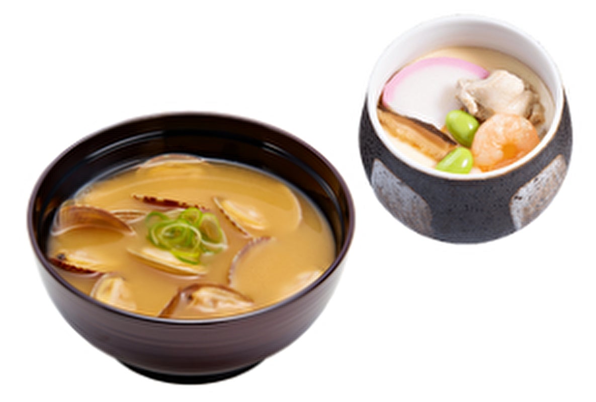 定番のサイドメニュー、あさりの味噌汁・茶碗蒸しのセットです。