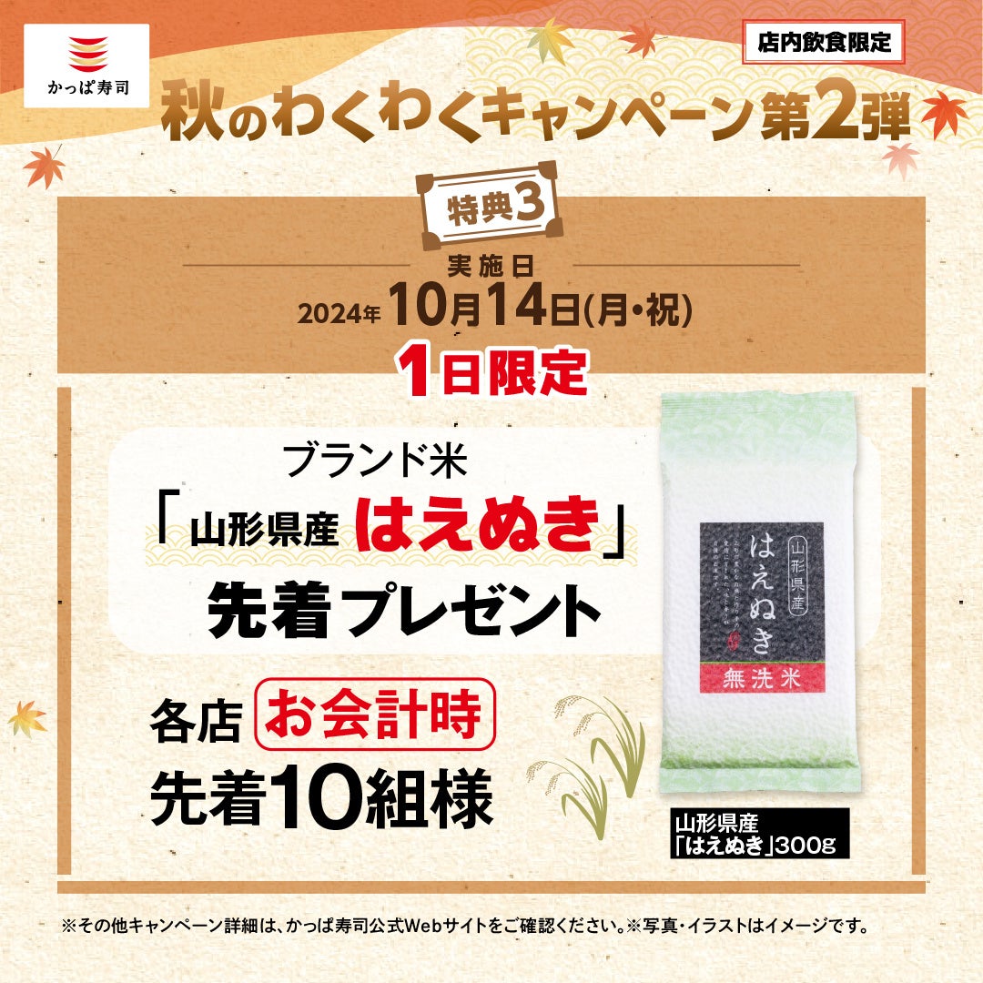 特典3つ目は、お米不足が叫ばれている中、ご家庭でも美味しいお米をお召し上がりいただけるよう、シャリに使用している、山形県産ブランド米「はえぬき」300g を各店お会計先着10組様にプレゼントいたします。(店内飲食限定、1組様1会計あたり税込1,700円以上のお会計の方が対象)