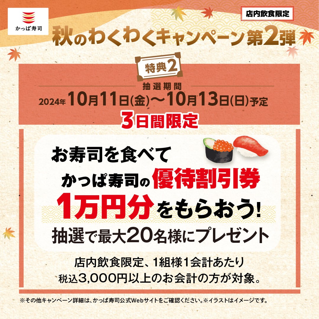 ・内 容:店内飲食限定で1組様1会計あたり税込3,000円以上のお会計の方を対象に、抽選で最大 20名様に1万円分のかっぱ寿司の優待割引券をプレゼント