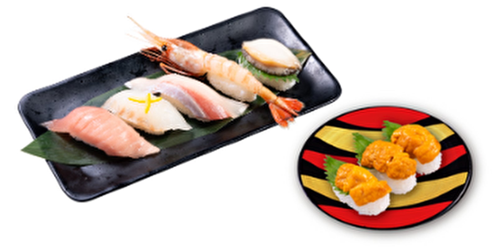 かっぱの極み贅沢にぎり五貫・贅沢新物うに三昧がいっしょに 楽しめるセットです。