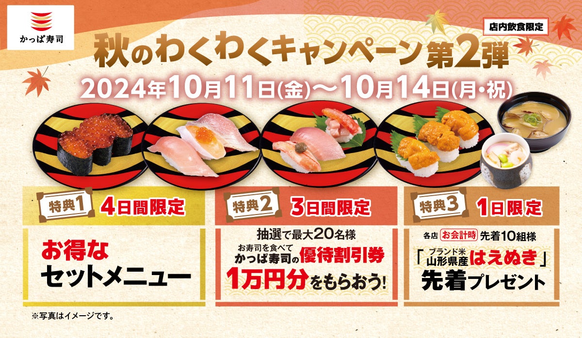 コロワイドグループのかっぱ寿司(カッパ・クリエイト㈱ 本社:神奈川県横浜市、代表取締役社長:山角豪)は、2024年10月11日(金)~10月14日(月・祝)の期間、『秋のわくわくキャンペーン第2弾』を、かっぱ寿司全店で開催いたします。