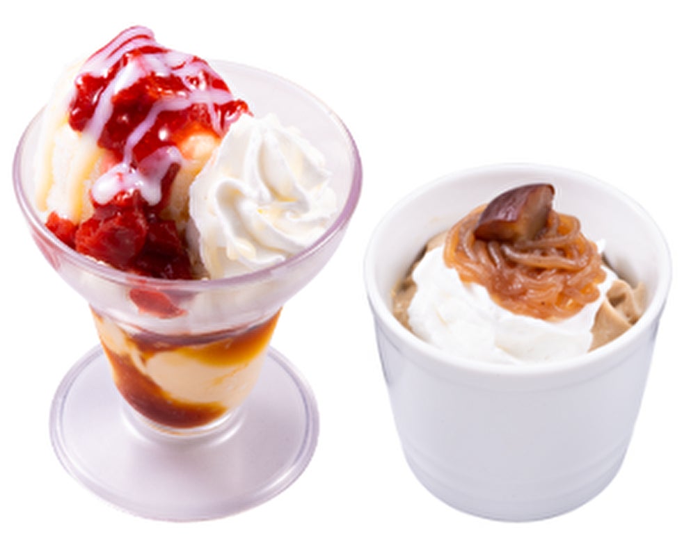 かっぱ寿司で人気のごちCAFEシリーズより、いちごのプレミア ムプリンパフェと、プレミアムモンブランプリンのセットです。