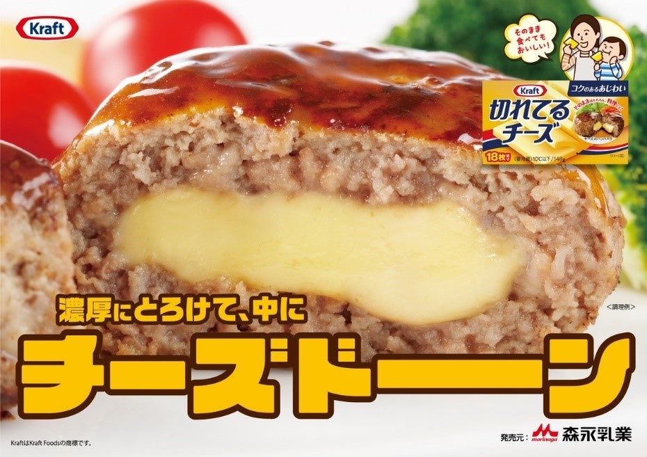 CMでは、日常の中にある親子の楽しみ、喜びのそばに「クラフト 切れてるチーズ」があるというコンセプトで、キッチンでの出来事を描きました。この日のメニューはハンバーグ。「クラフト 切れてるチーズ」は、予め同じ大きさにスライスされており、パッと取り出しハンバーグの中に入れるだけで簡単に“チーズinハンバーグ”がつくれます。加熱するとほどよくとろけチーズの形が残りやすいため、見た目も贅沢で濃厚なチーズが食欲をそそります。