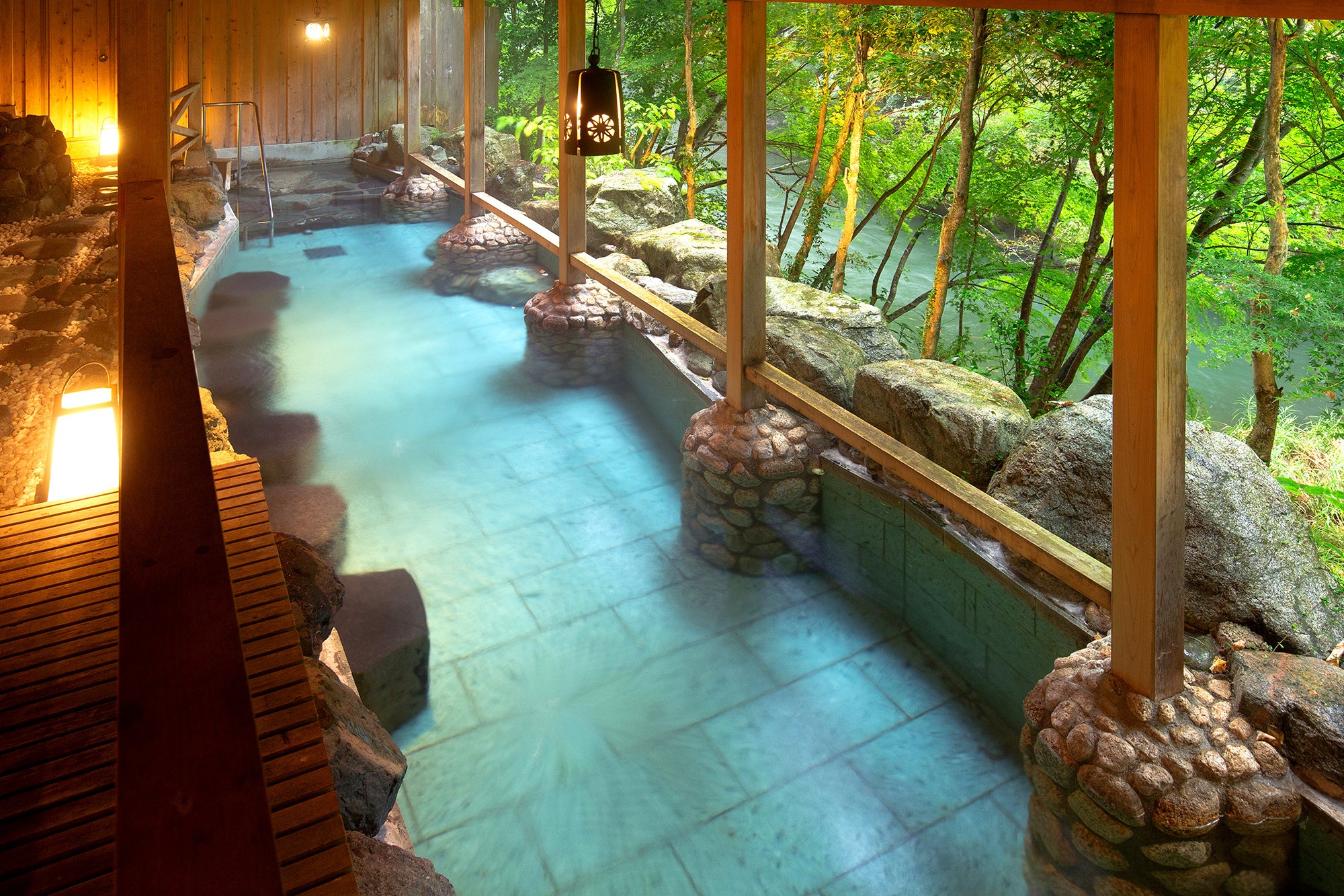 温泉大浴場や露天風呂、ロビー、客室、レストランから「鶴仙渓」を一望し、四季折々の情景をゆったりとご覧いただけます。